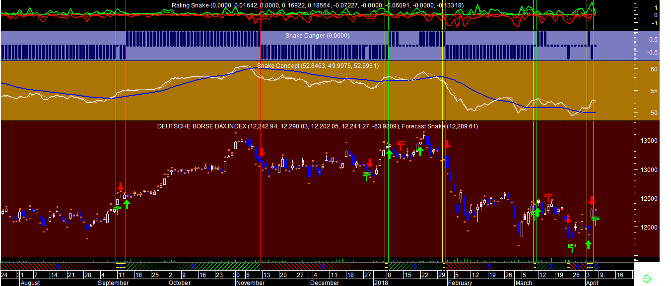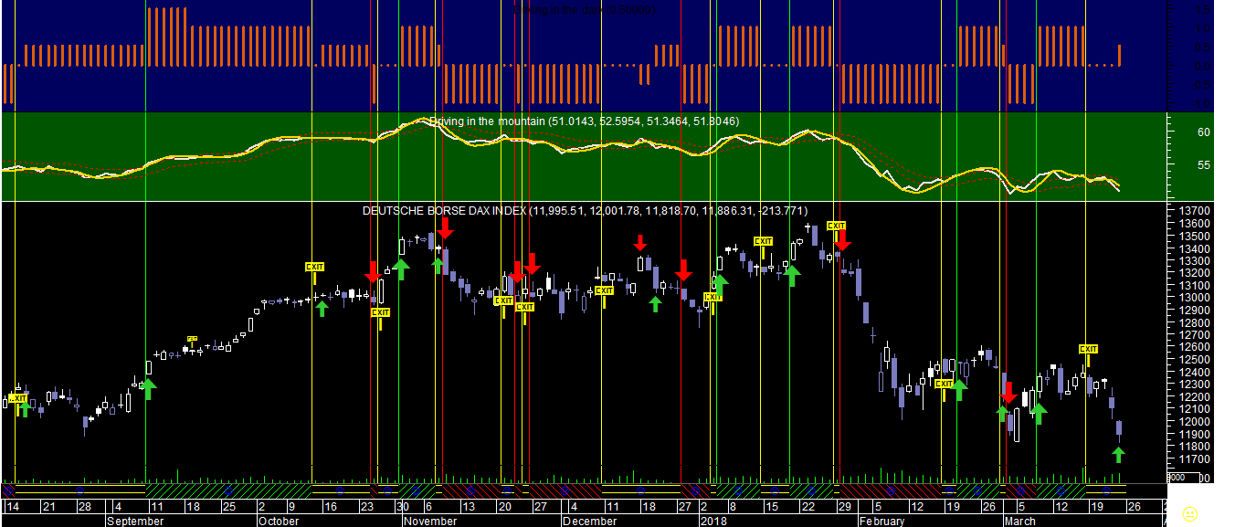 Gráficos de hoje no DAX e na Daimler em sistemas de trading diferentes apresentam uma pequena curiosidade de aparecerem com uns sinais de compra apesar do castigo infligido ao setor acionista, insinuando que a correçäo de curto prazo terá ido um pouco longe de mais. No entanto os sinais de compra säo ainda insuficientes para compensar a negatividade do conjunto dos restantes sistemas que mantêm no geral um a panorâmica pouco risonha.