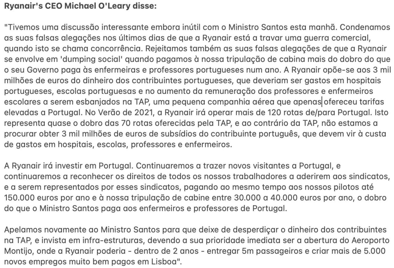 Dito isto, a Ryanair com os apoios que recebe para voar (nao me hei de esquecer de um voo Dublin Santander que fiz em que paguei menos de 10 euros) tambem pode falar pouco...