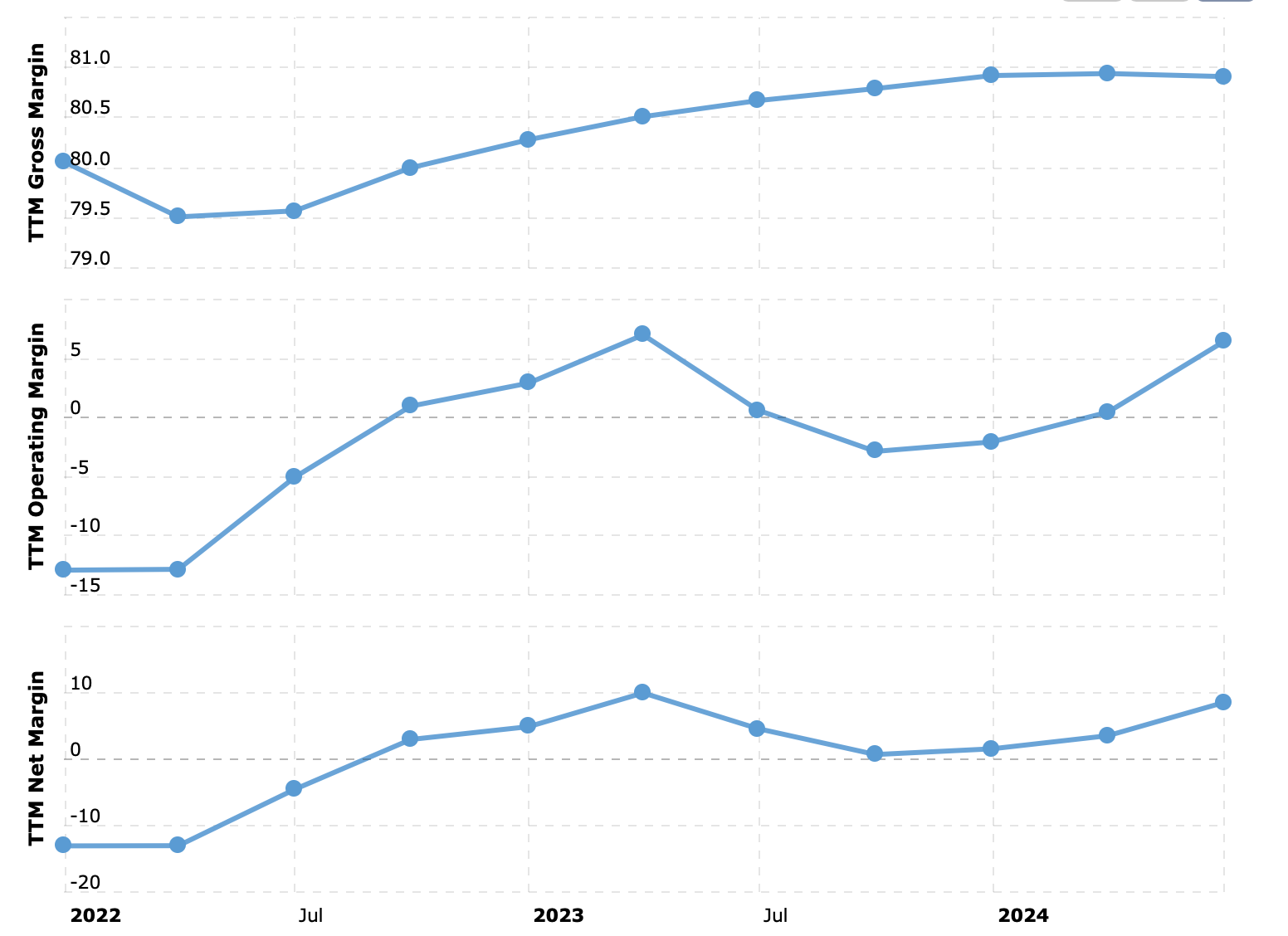 Começando pelos pontos negativos óbvios: a taxa de crescimento de receitas no último trimestre foi de apenas 10% e a margem operacional TTM está em -13.1%. Uma empresa a crescer receitas apenas 10% já deveria estar a dar lucro. É certo que -13% não é assim tão negativo mas a margem operacional que tinha vindo a melhorar substancialmente desde 2022, nos últimos dois trimestres não apresentou melhorias. Uma empresa com crescimento de receitas de 10% e margem operacional negativa estagnada não vai a lado nenhum.