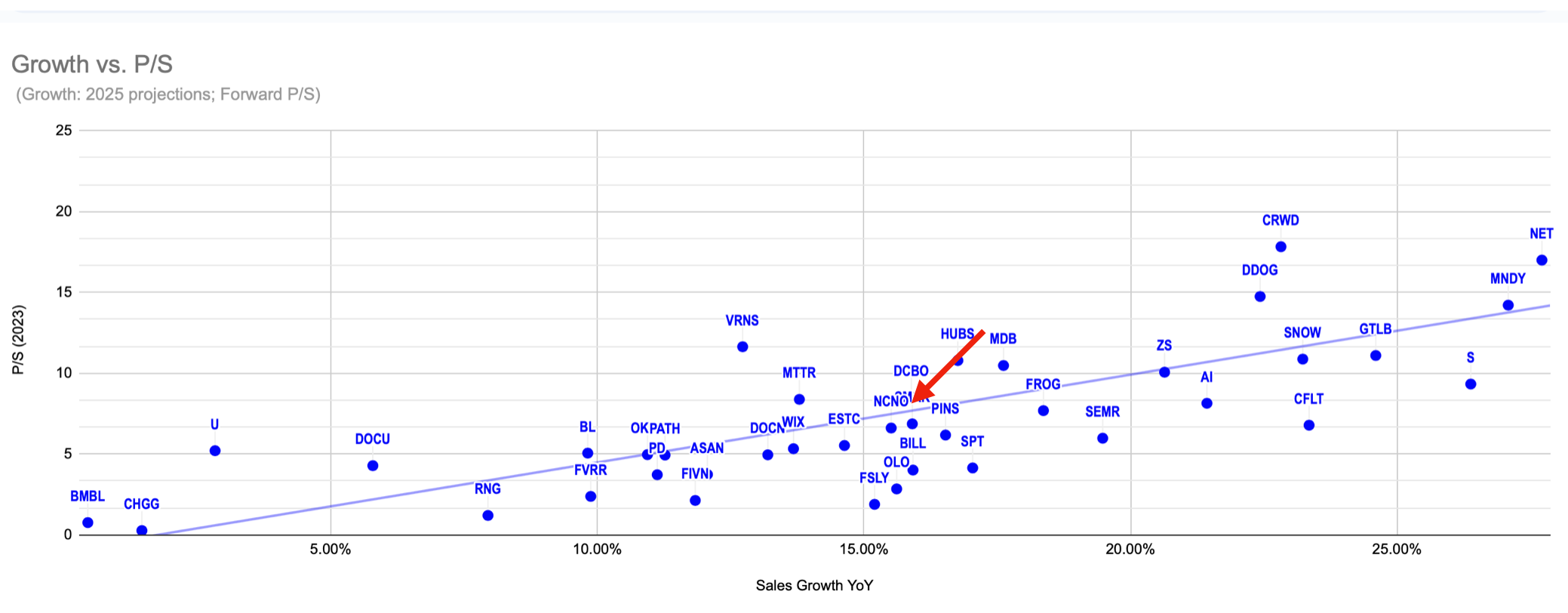 A preços de hoje o EV/S (TTM) é de 3.92, o que é um valor convidativo para uma empresa de cloud com receitas recorrentes. Avaliando a métrica P/S, em termos comparativos, está próximo da OLO e da FSLY empresas com problemas e que apresentam pesados prejuízos ao passo que a BILL apresentou já lucros no último trimestre