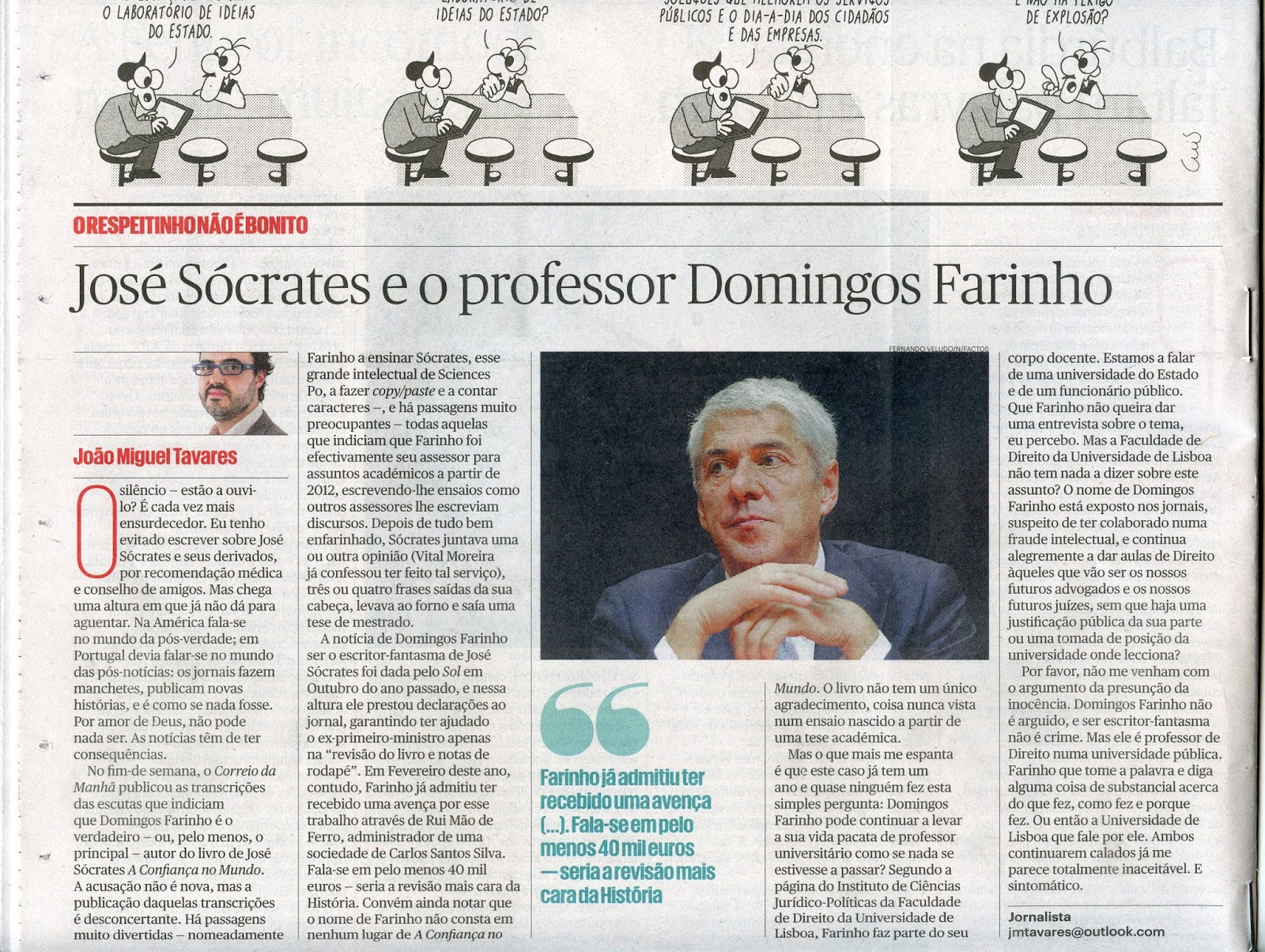 Mas ainda há outra: segundo consta, a mulher do docente recebeu o estipêndio do livro que se apresta a sair por estes dias, em vez do docente, o verdadeiro titular a esse rendimento colectável.