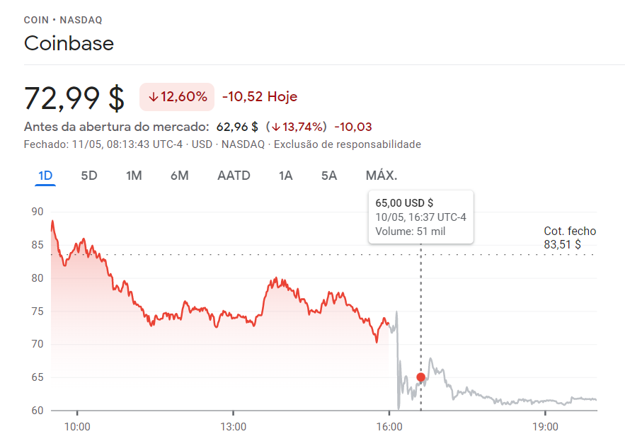 A CoinBase tem no pós-fecho o valor de $13 601 427 768 - 13B$