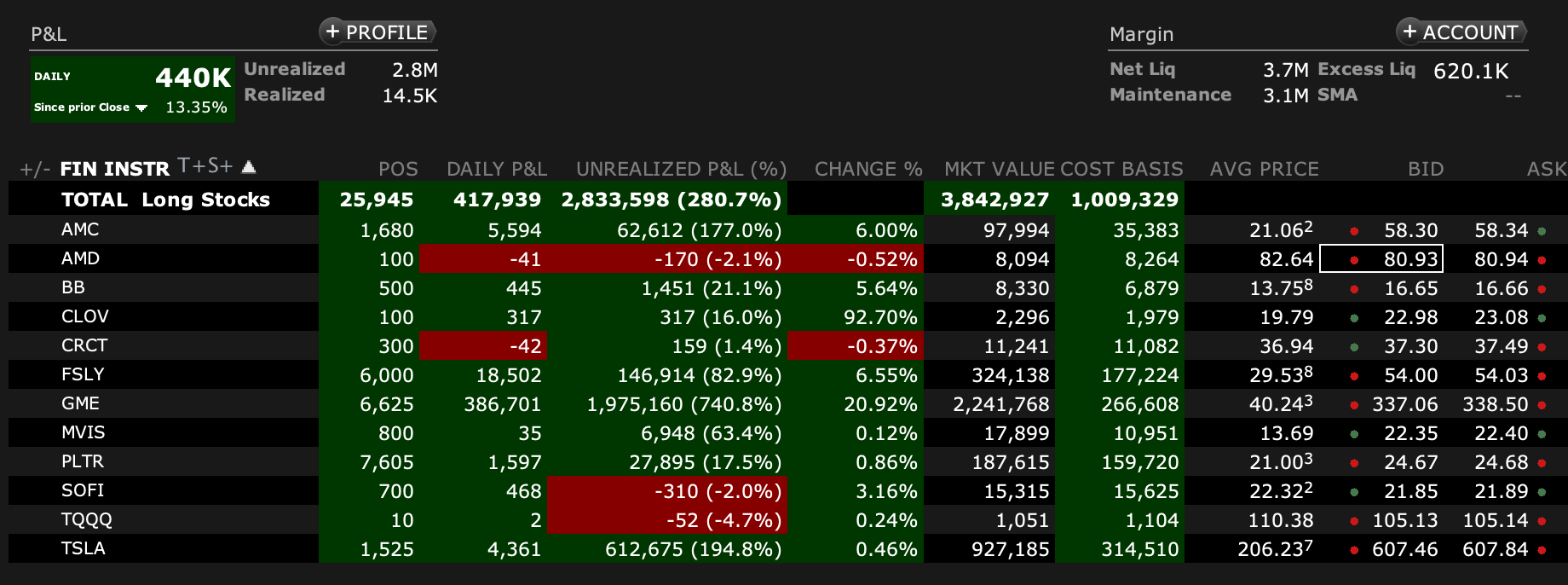 Mantenho posições WSB que não se baseiam em shortsqueezes e onde vejo valor fundamental e especulativo (e tb por isso têm performances muito menores e no caso da Coin, a performance é mesmo negativa): Tesla (posição média que hoje até desce), Palantir (posição média e forte) e Coinbase (posição pequena onde continuo forte/e negativo).