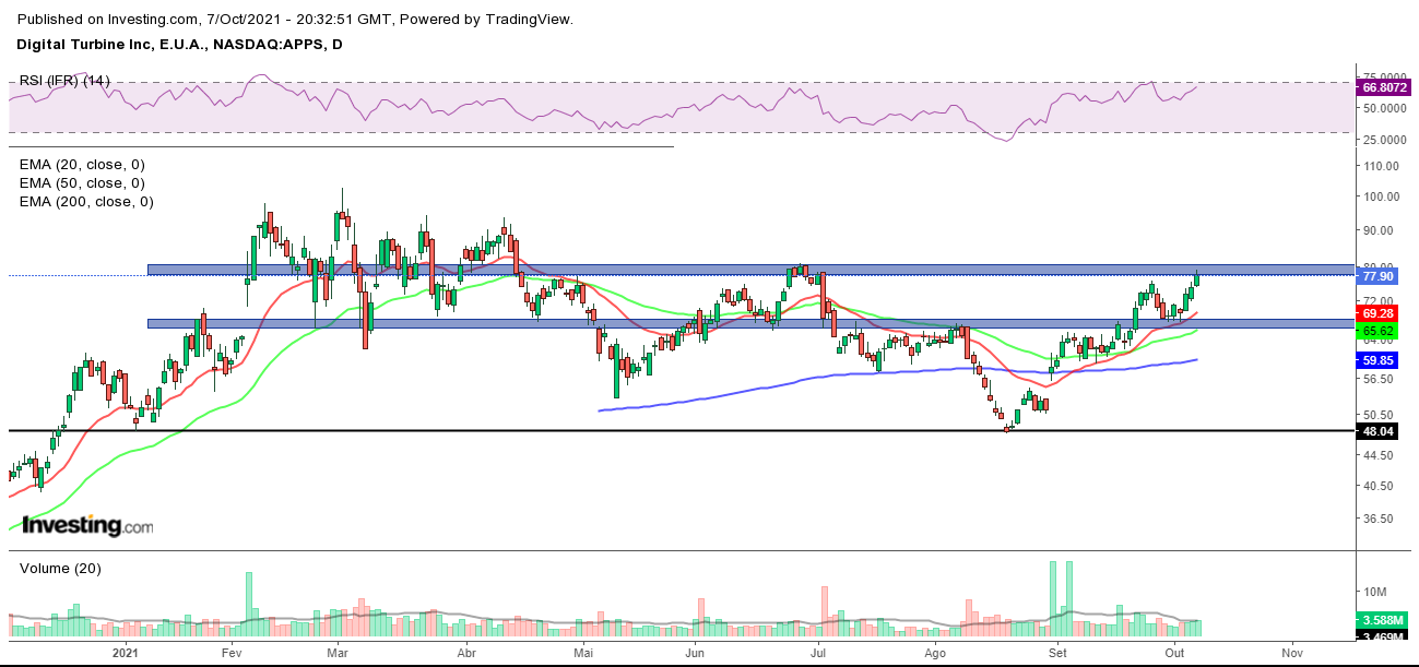 Deverá atacar brevemente a resistência na zona dos $80, vamos ver se a ultrapassa à primeira...