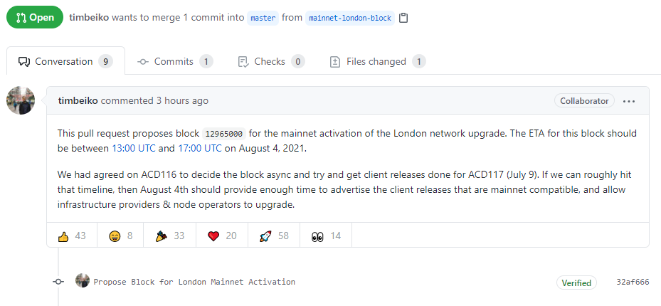 Propose Block for London Mainnet Activation #223