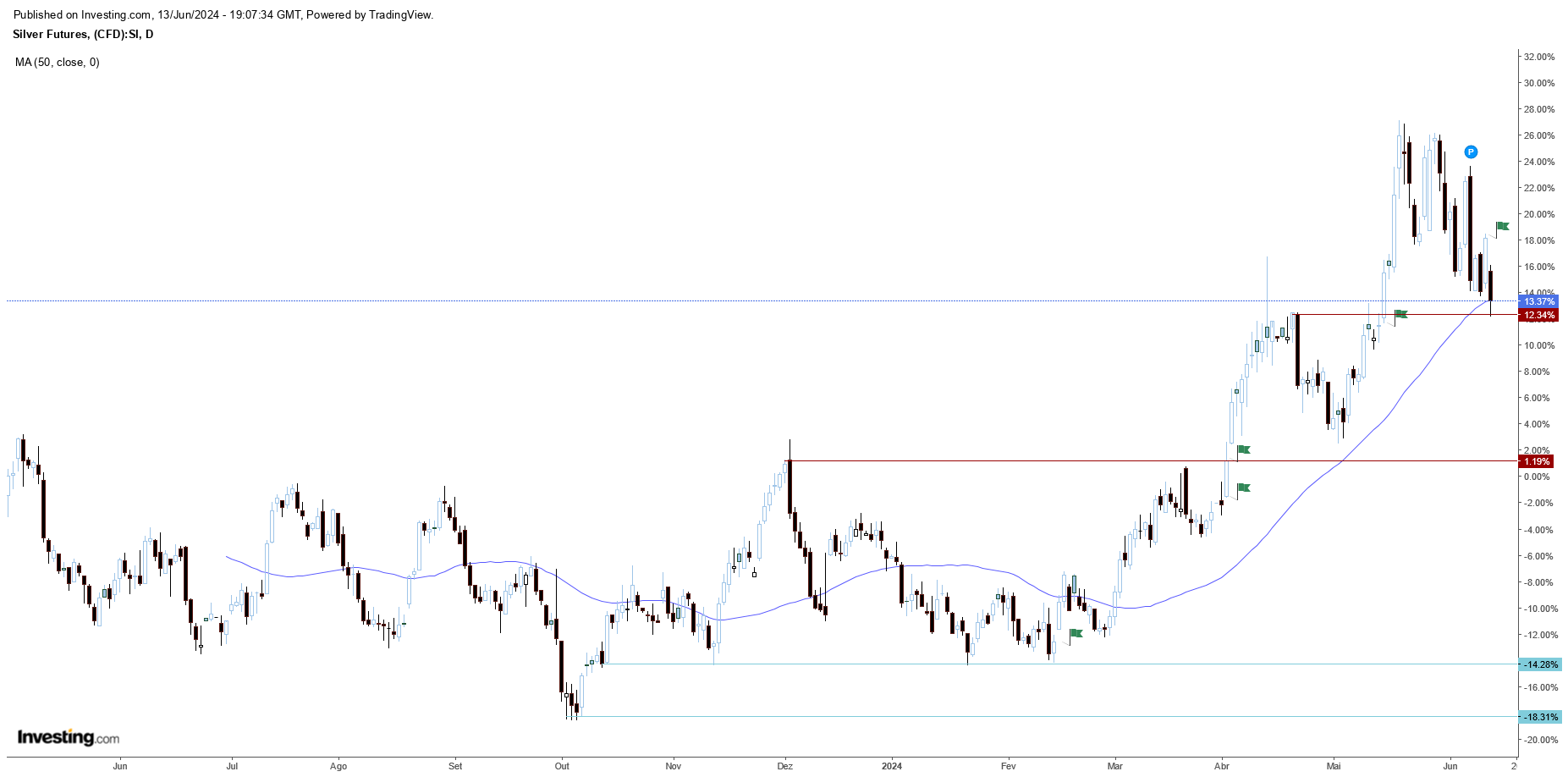 O ETF short à prata, ainda não reflete a integra, o movimento descendente de 13% relativamente aos últimos máximos.