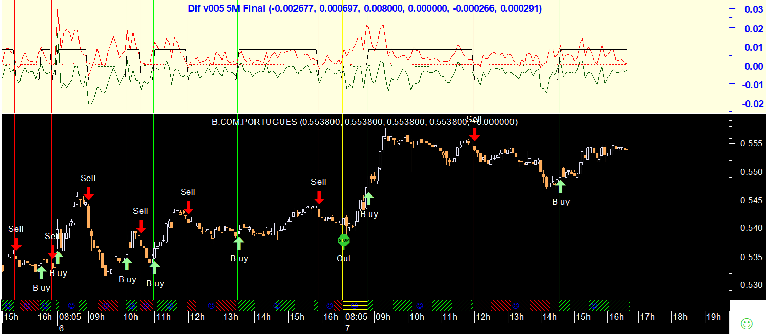 O indicador dá pelo nome de “Dif v005 1D”, em que “1D” corresponde aos parâmetros internos das sub-rotinas adaptados à escala diária, funcionando de modo muito simples: sempre que a linha verde em traço cheio penetra a linha verde tracejada é acionado um sinal de compra, que só é revertido por um sinal de venda quando a linha vermelha a cheio intercepta a linha vermelha tracejada.