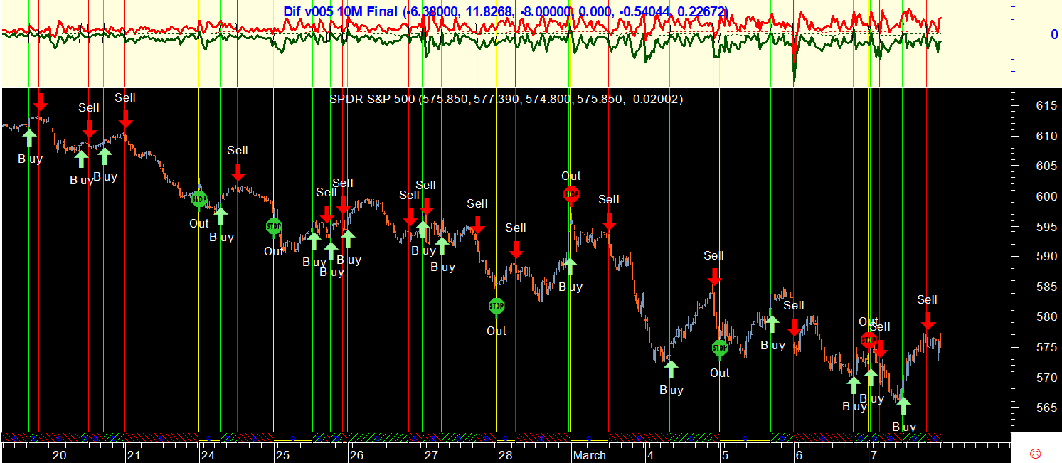 Já agora complemento com um gráfico do BCP na escala dos 5 minutos, com os sinais gerados por este inovador sistema de trading relativos aos últimos dois dias de negociação, ou seja, dias 6 e 7 de março, e também dos sinais do S&P 500 na escala de 10 minutos no período de 20 de fevereiro até á data presente, comprovando que o indicador possui um comportamento muito interessante em qualquer escala temporal que se pretenda negociar.