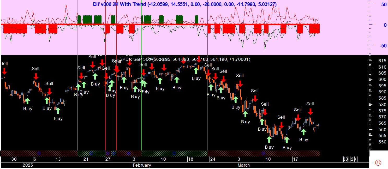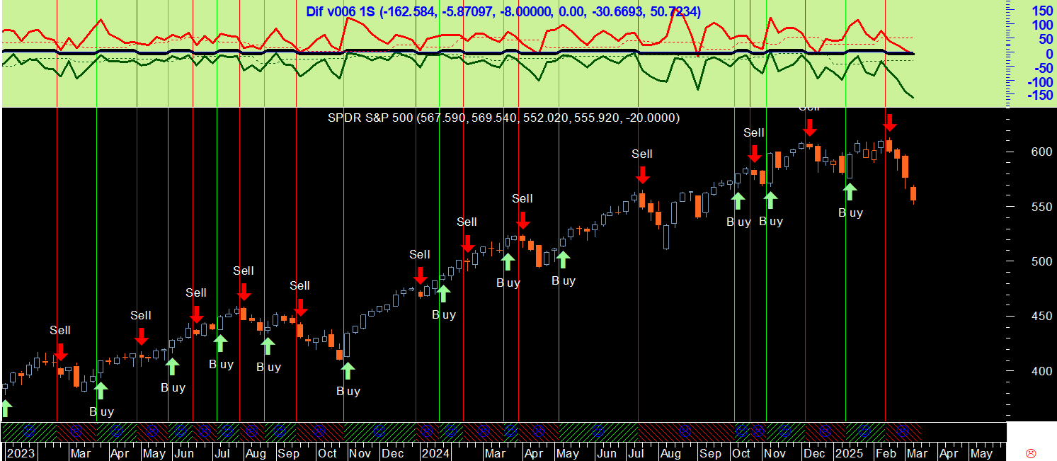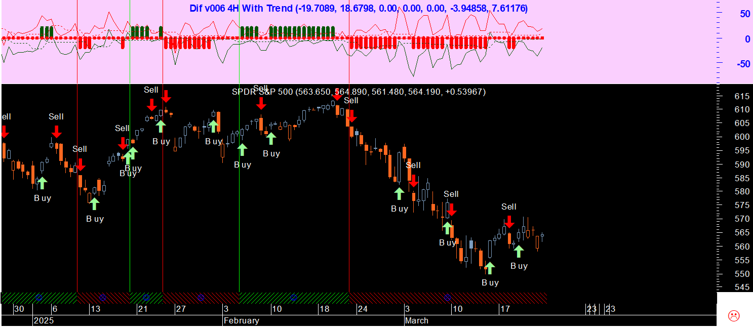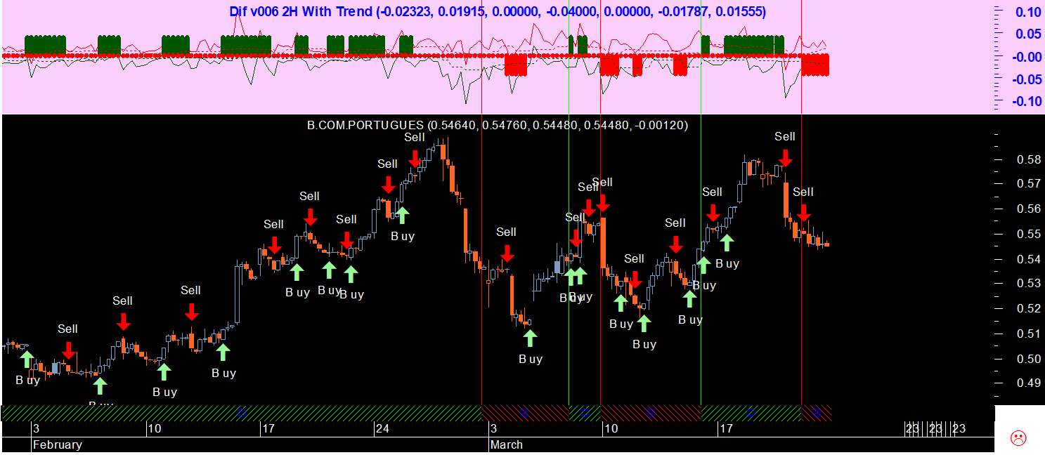 Para verificar situações em que devemos estar comprados ou vendidos basta olhar para o indicador de cima nas barras grossas verticais; se estiver verde deveremos estar comprados e se estiver vermelho o conselho é estar vendido, Nas restantes situações o conselho será para ficar de fora a aguardar novas oportunidades.