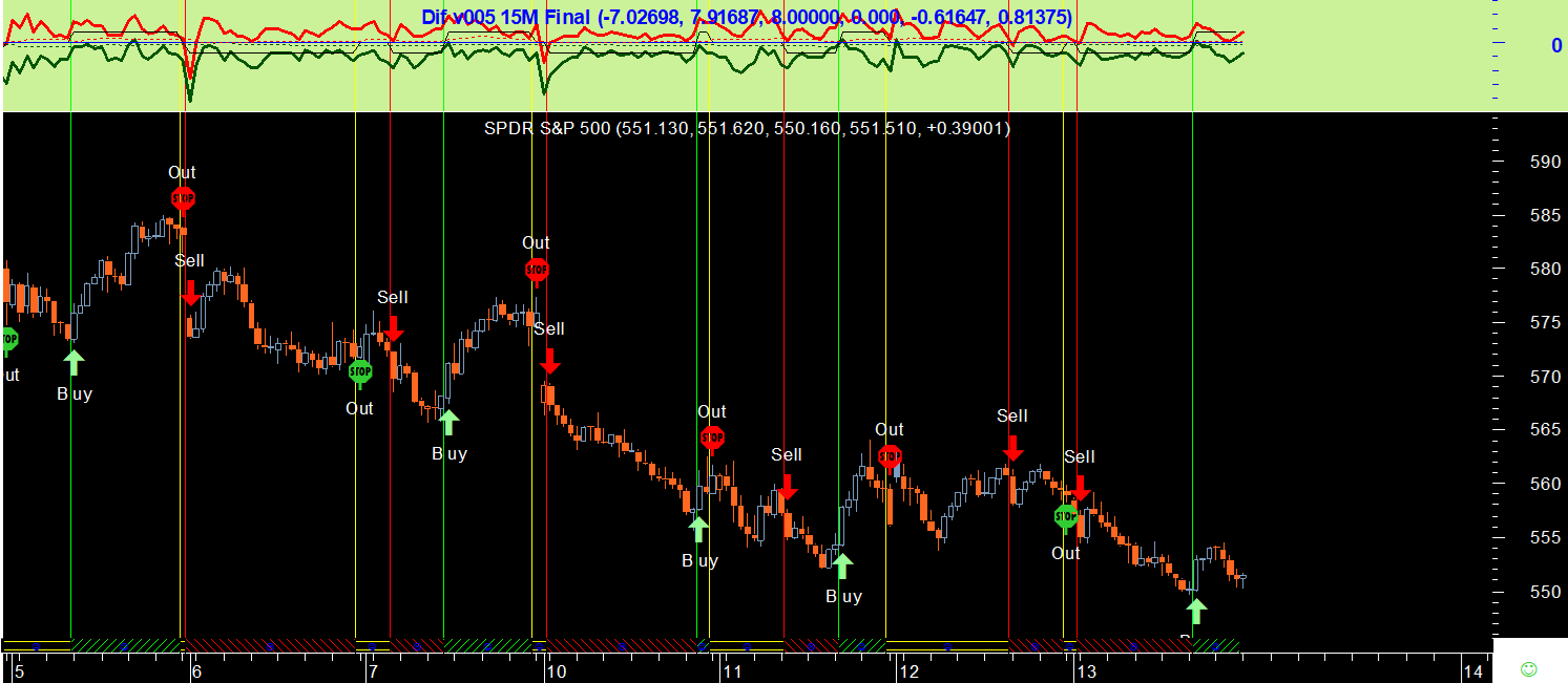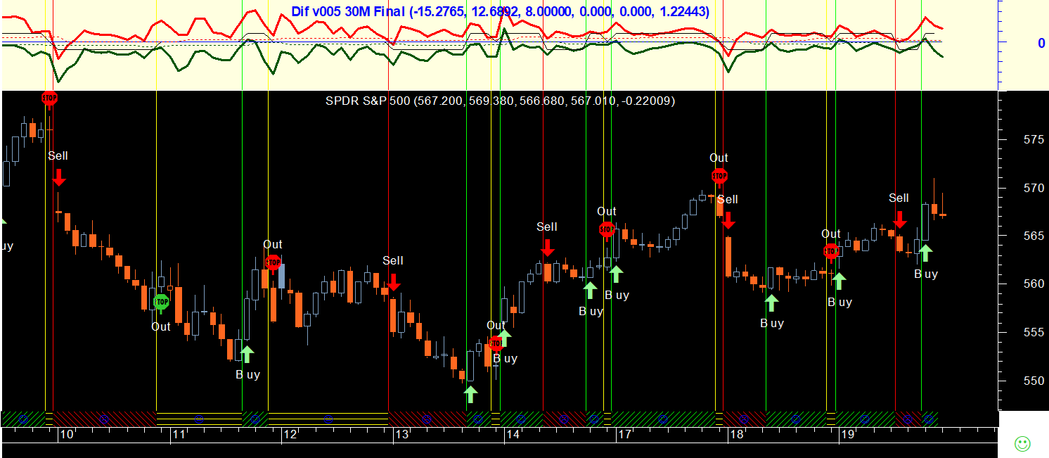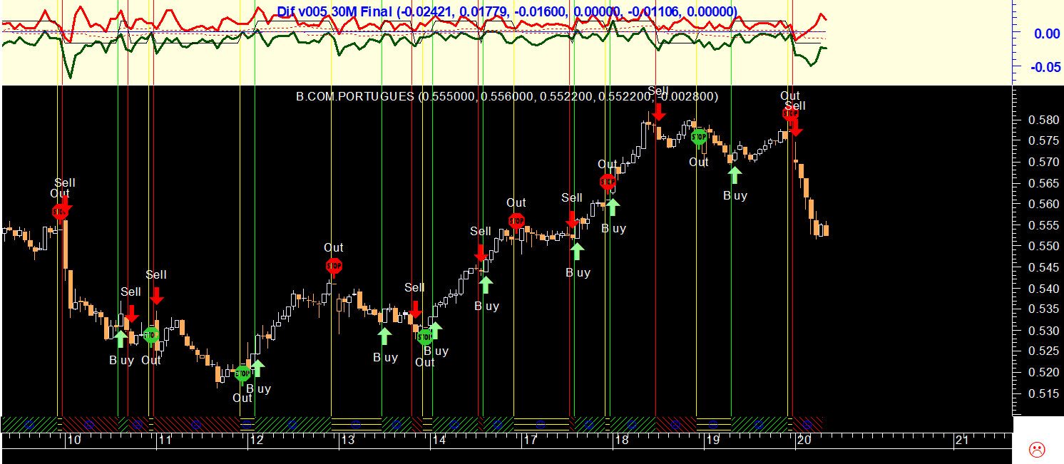 Se me pedissem para dizer que posição estaria agora a assumir no mercado, eu teria de usar um indicador tendencial fiável em escalas acima da meia hora. Por outro lado o swing trading, do tipo do indicador “Dif v005” aqui apresentado, é mais dedicado a malucos do meu género que têm tempo disponível à tarde para se dedicar ao mercado, para ser negociado numa carteira paralela e numa perspetiva necessariamente mais rápida e independente das tendências do “position trading” devido às tentativas de aproveitamento dos ciclos individuais que compõem uma tendência no seu conjunto.