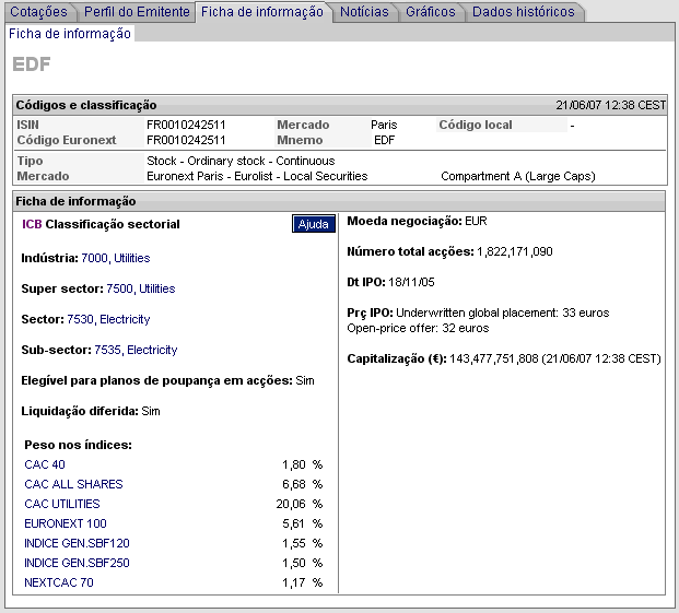 fiódor Escreveu:As acções da Électricité de France (EDF) dispararam hoje mais de 5%, atingindo um máximo histórico, e superaram o valor de mercado da Total, tornando-se assim a maior cotada da Zona Euro. O catalisador das acções foi a revisão em alta do preço-alvo por parte dos analistas.