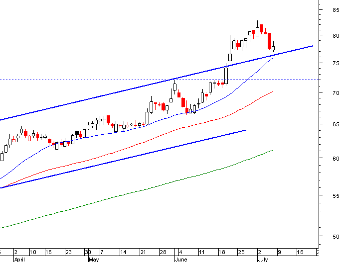 Hoje fez uma bela vela branca a subir mais de 2,5% para fechar nos 78,74. Agora há que observar o comportamento nos 81 para ver se a tendência ascendente se mantém.