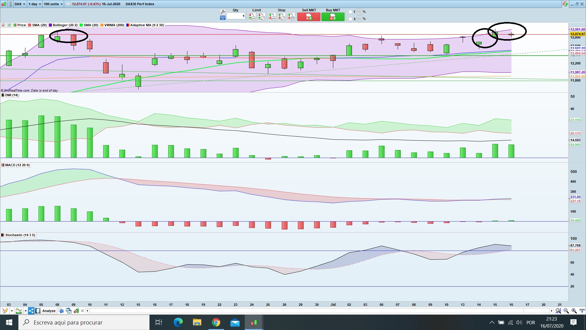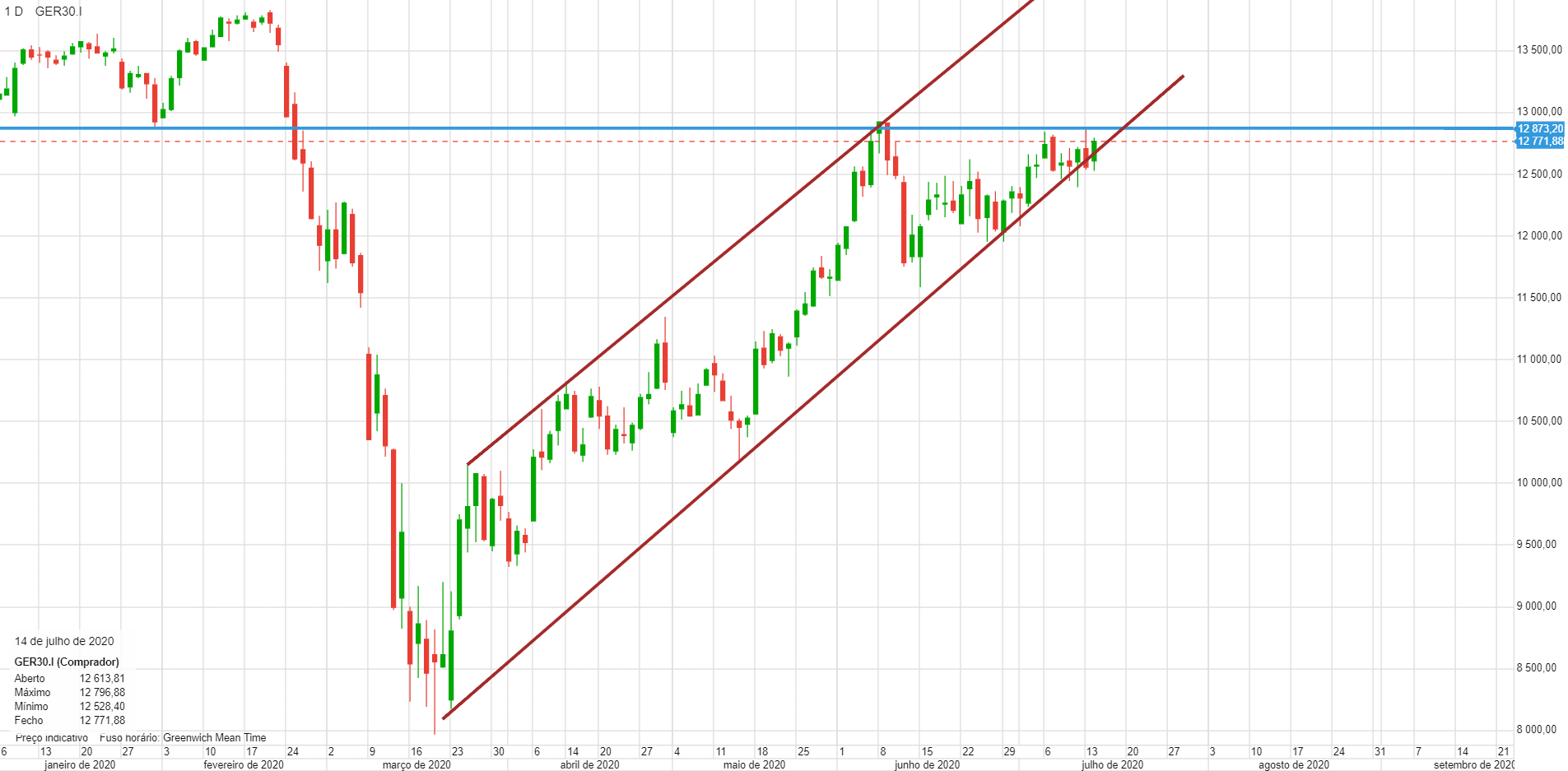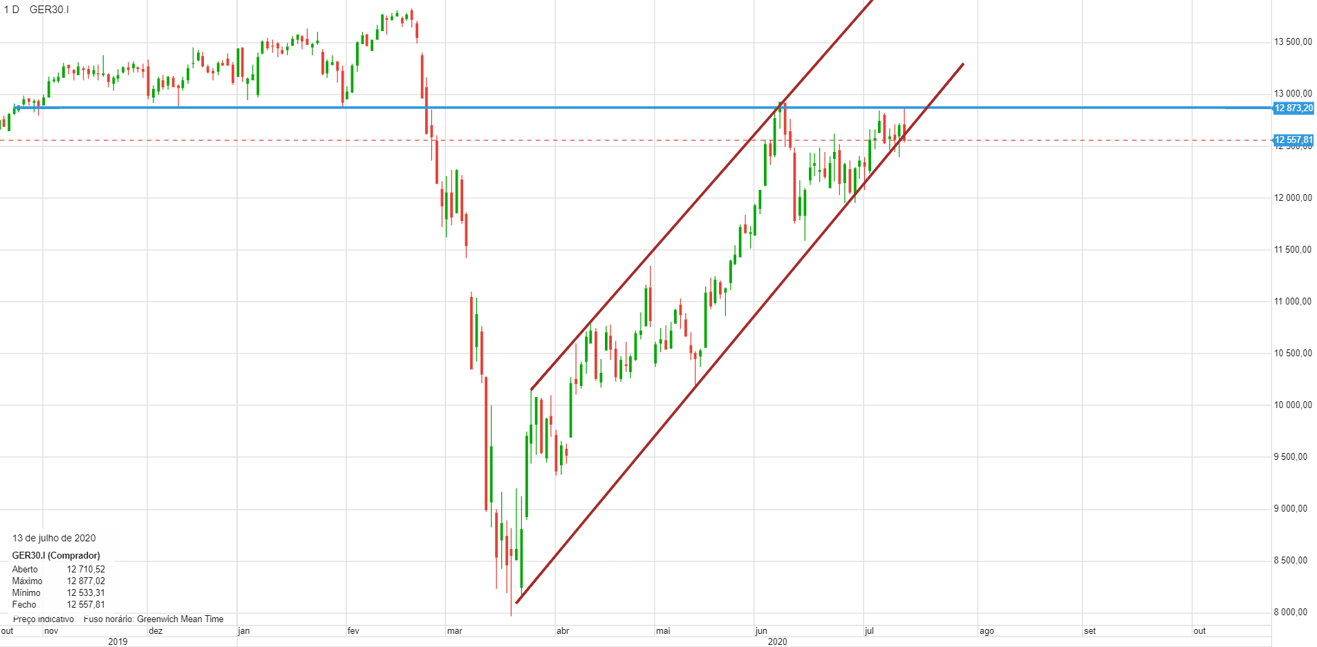 O dax pode estar a fazer um duplo topo. o dia de hoje não foi bom para a tendência dominante, e pode sinalizar uma inversão, pelo menos de curto prazo. o canal ascendente, que já vinha a ser testado à vários dias e a suportar a subida , ainda aguentou, pelo que conclusões apocalípticas, podem ser prematuras, mas que está com mau aspecto, isso é inegável. eu pessoalmente, abri uns curtos antes do fecho. Uma variação intraday desta dimensão, nos principais indices, normalmente tem consequencias nos dias seguintes.