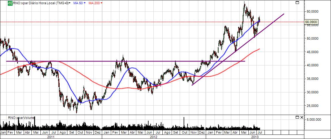 Se colocar-mos os gráficos do CAC40 e da Renaut lado a lado, podemos constatar que o seu desenho é muito muito parecido. Pelo menos nos últimos anos a Renault tem seguido bastante a tendência do CAC.
