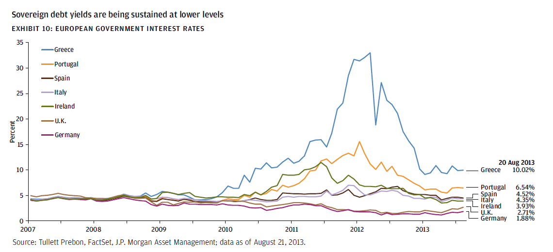 to bid down the yields on sovereign debt, reducing the risk of another financial crisis. In the real economy, the Eurozone composite Purchasing Managers Index (PMI) in July was at its highest level in two years, suggesting a return to positive real GDP growth. At a more micro level, the economy is benefiting from improving consumer confidence, a return to trade surplus and plenty of accumulated pent-up demand.