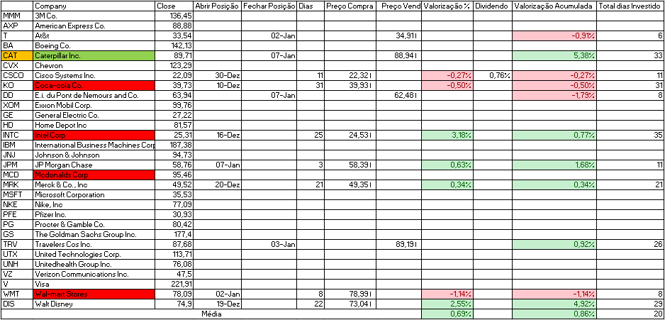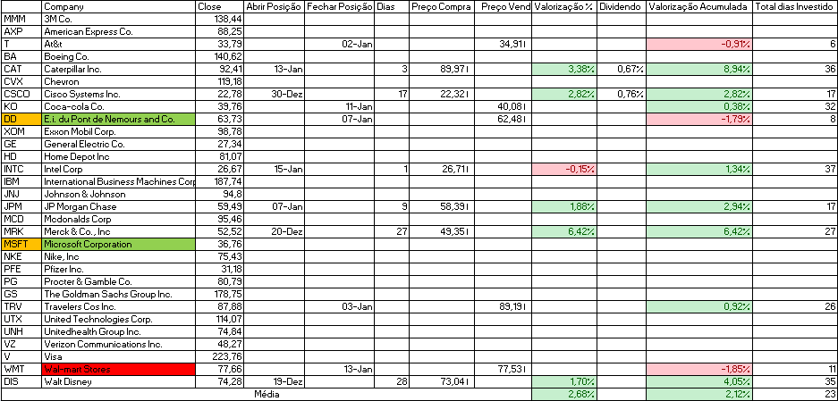 Hoje como indicado adquirimos United Technologies Corp. e vendemos E.i. du Pont de Nemours and Co., Microsoft Corporation e Walt Disney.