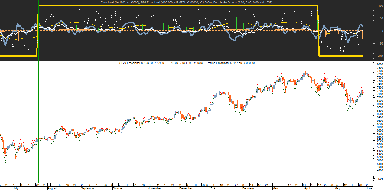 Esta conclusão resulta de um aumento generalizado da volatilidade no mercado, embora ainda pouco percetível, altura que normalmente os sistemas de trading deste tipo costumam acertar o passo com os ganhos da carteira. Para isso necessitam, no caso concreto deste sistema “Emocional 2014”, de cerca de 2 a 3 semanas para acertar agulhas e definir corretamente o sentido predominante do mercado, se este for em geral contrário à posição maioritária assumida, neste caso uma tendência maioritariamente virada para baixo.
