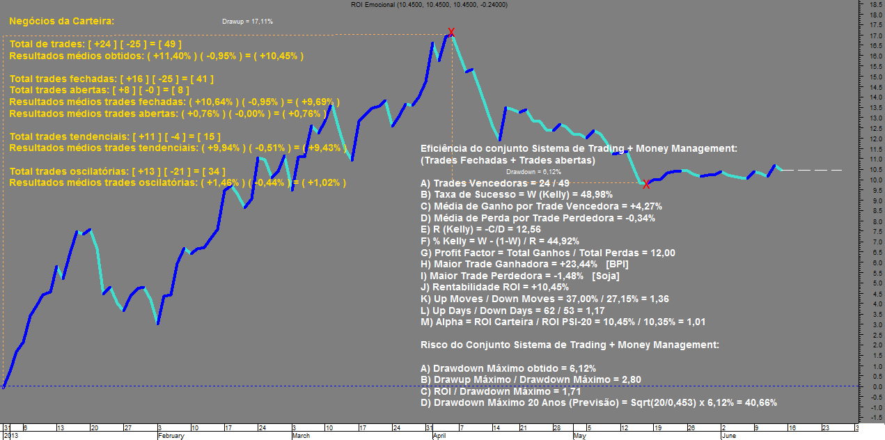 Curiosamente a performance atual da carteira aproxima-se muito dos resultados dos testes porque estamos a passar por um ciclo co0mpleto de compras e fechos/inversões de posições tendenciais. A rentabilidade atual de +10,45% registada na carteira corresponde em grande medida ao valor que revelei mais atrás sobre a média que obtive nos testes, um retorno médio de +1,75% ao mês, o que em 6 meses significaria uma rentabilidade esperada de 1,75%/mês x 6 meses = 10,50%.