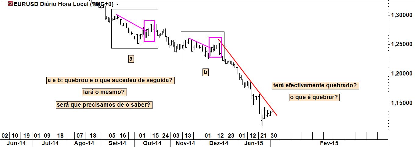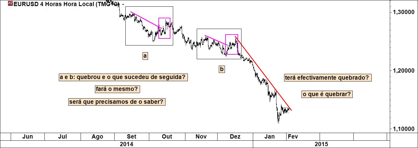 O conteúdo da afirmação que sublinho não é tão tão linear como a priori se possa considerar: a probabilidade de chegar ao target será tanto maior quanto melhor/mais intensa for a quebra de uma linha (ou de um outro nível). A quebra de uma qualquer linha por uma vela que ainda não fechou no seu respectivo timeframe (em formação) pode induzir a leituras apressadas.