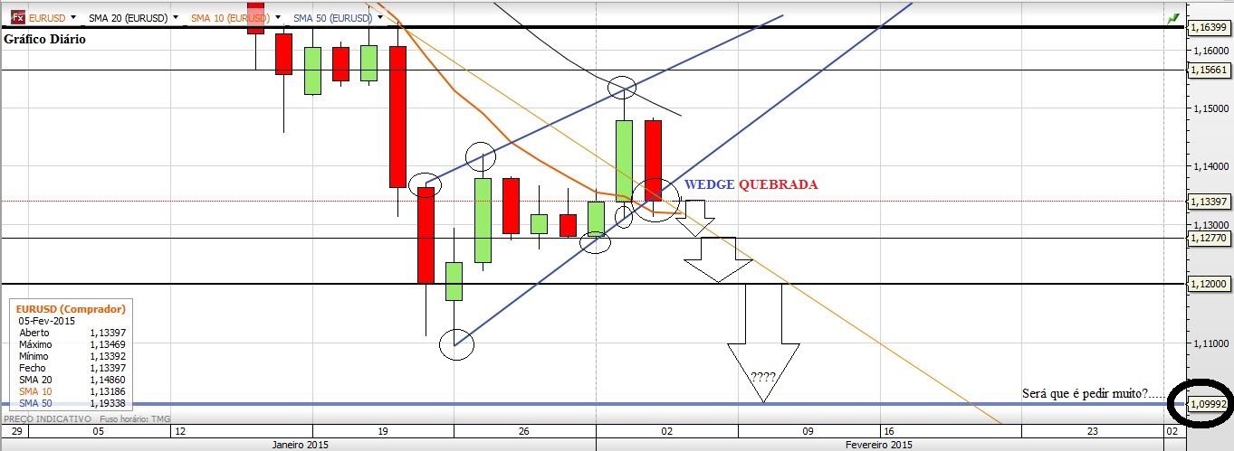 Parece que o EURUSD quebrou a tal Wedge. Parece que poderá haver uma forte possibilidade de acontecer uma nova queda expressiva. Curto ao dia de hoje.