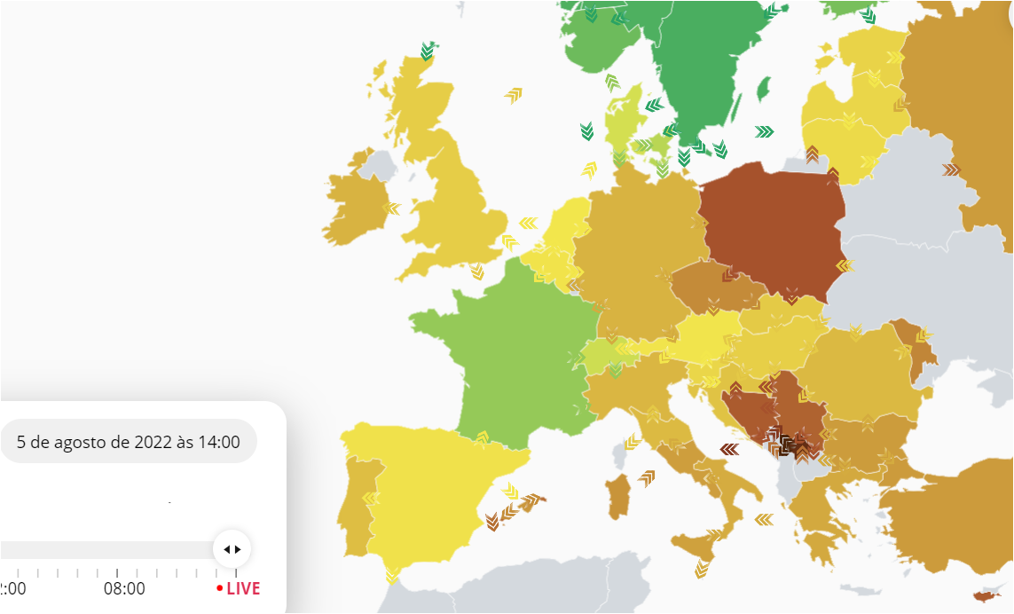 Às 14:00 importava energia de Inglaterra, Alemanha, da Bélgica e de Espanha (o campeão das renováveis) por não ter apostado nas renováveis. Ver mapa infra.