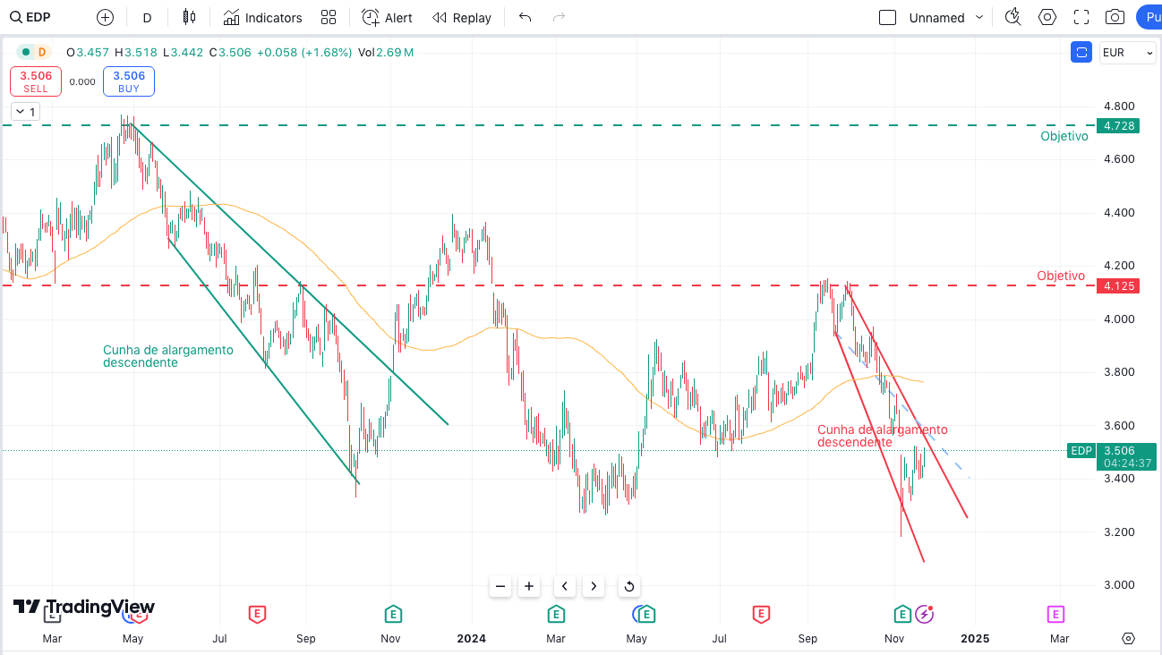 Em 2023, a EDP formou o que parecia ser uma cunha de alargamento descendente e subiu. No entanto, depois de já ter subido mais de metade até ao objetivo, voltou a descer. Acho que as cunhas que tenho vão atingir o objetivo, mas este é um exemplo de como nem sempre vai direto ao objetivo.