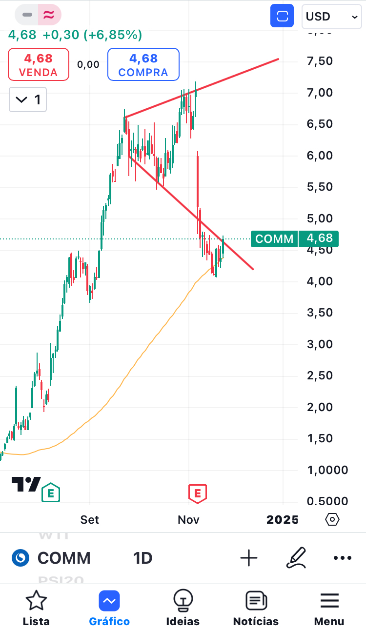 A COMM tem uma espécie de triângulo. Chegou a quebrar em baixa, mas voltou para dentro do triângulo. Acredito que pode continuar a recuperar.