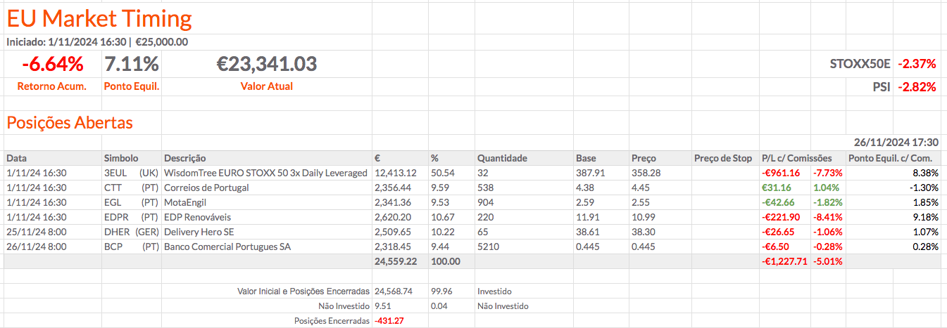 A carteira europeia está negativa e mais negativa do que os índices, mas isso é normal porque o 3EUL é alavancado e metade do valor está nele. Quando os índices recuperarem, espero que a carteira recupere também.