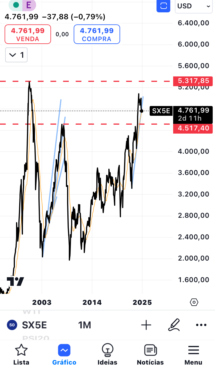 O Euro Stoxx 50 (SX5E) está a cerca de 12% do máximo histórico alcançado em 2000 e 5% acima do máximo de 2007.