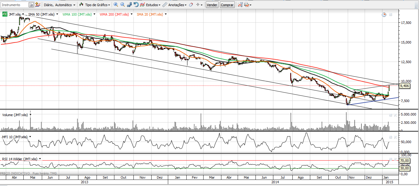 Graças aos resultados e ao bias positivo (traduzido no spike da cotação e do volume, acima da MM20, MM50 e MM100), rompeu com 5 meses de canal, e a LTMP passou a ascendente.