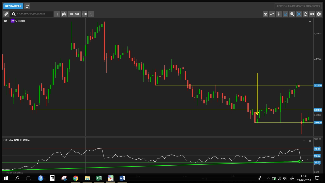 Desde da definição do suporte/resistência dos 3.04 EUR (no 4º Trimestre de 2017) que o volume tem sido superior, de forma consistente, ao verificado nos 3 anos anteriores o que pode indiciar uma zona de acumulação. (não coloquei o volume no gráfico mas no gráfico semanal é possível observar o que indiquei).