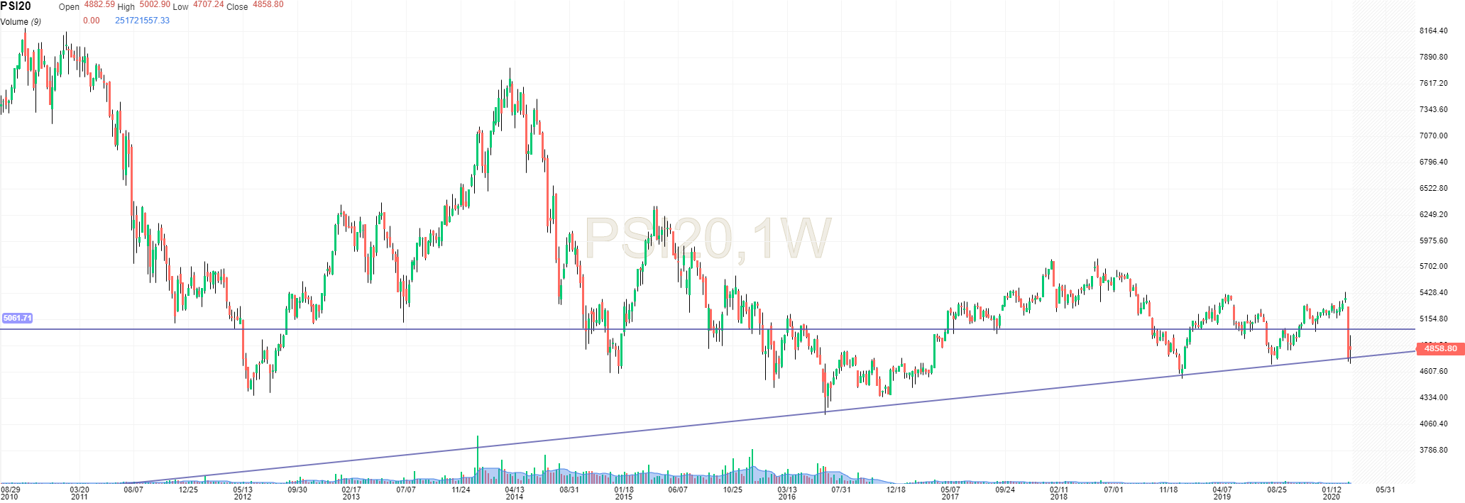 Eu deixo os gráficos actualizados. Podemos falar aqui num suporte entre os 4590 e os 4720, que são os mínimos de Dezembro de 2018 e Agosto de 2019. Mas só o digo porque quando um suporte decisivo importante é quebrado, não creio que haja interesse em saber qual o próximo. Em tendências descendentes o importante é saber quais as resistências pois, caso sejam quebradas, é sinal que a tendência se inverteu. Por isso, os meus olhos estão postos nos 5000/5050 pontos, enquanto essa resistência não for quebrada, as subidas devem ser vistas como meros ressaltos.