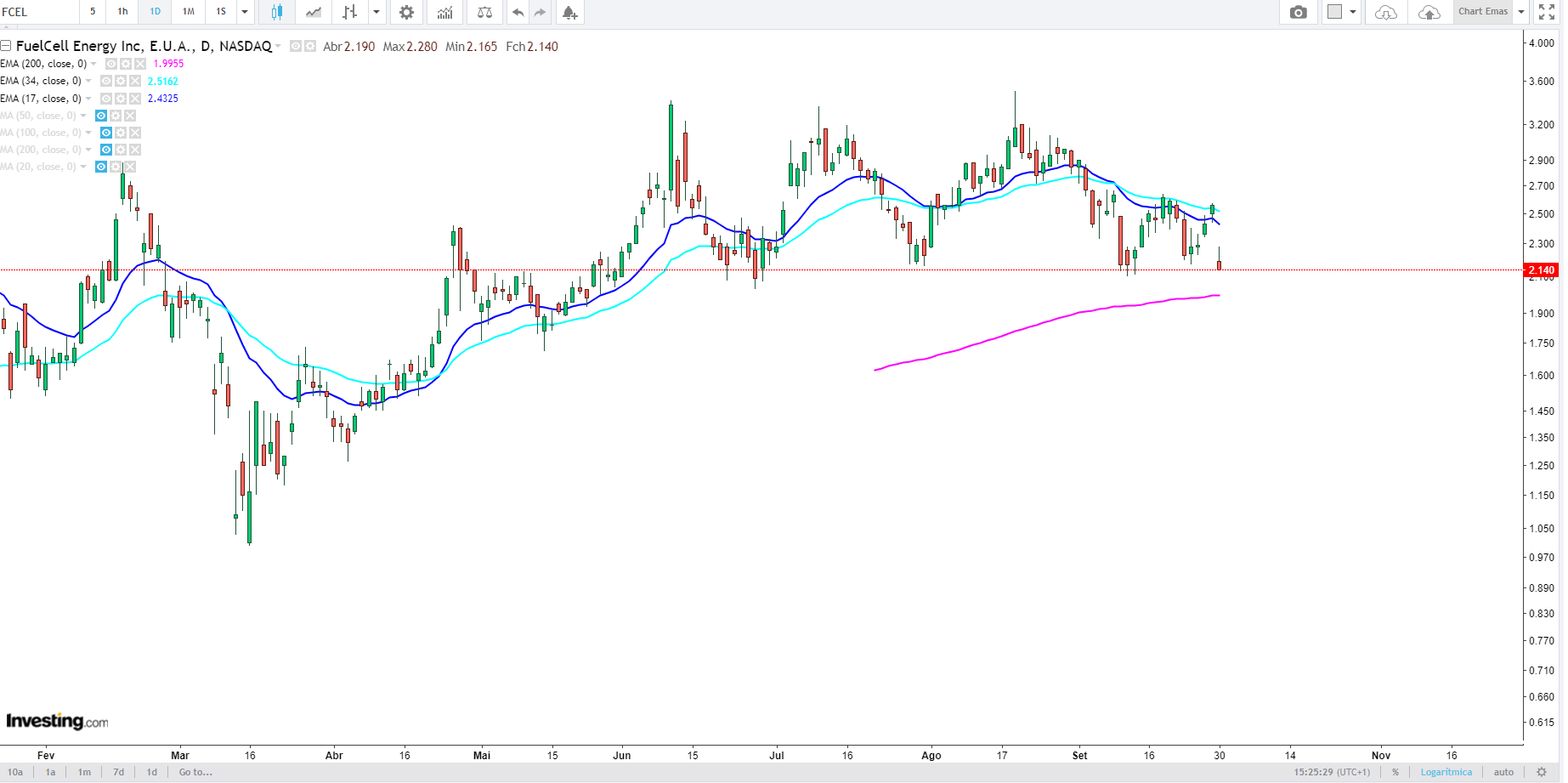Acabei por entrar hoje a $2,11, com stop nos $1,92, sendo certo que admito que a FCEL possa não ter grande volatilidade nos próximos (independentemente do sentido).