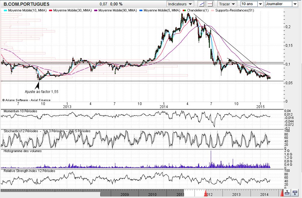 Raposo Tavares Escreveu:O gráfico que estou a usar não tem as cotações ajustadas. O ajuste foi ao factor 1,55, salvo erro. De qualquer forma, a carga deste duplo fundo é de ordem psicológica. (Num gráfico ajustado, como é vísivel nos riscos do Ulisses, corresponde a um suporte com o mesmo espaço temporal e no mesmo valor (próximo dos 0,056/0,058)...).