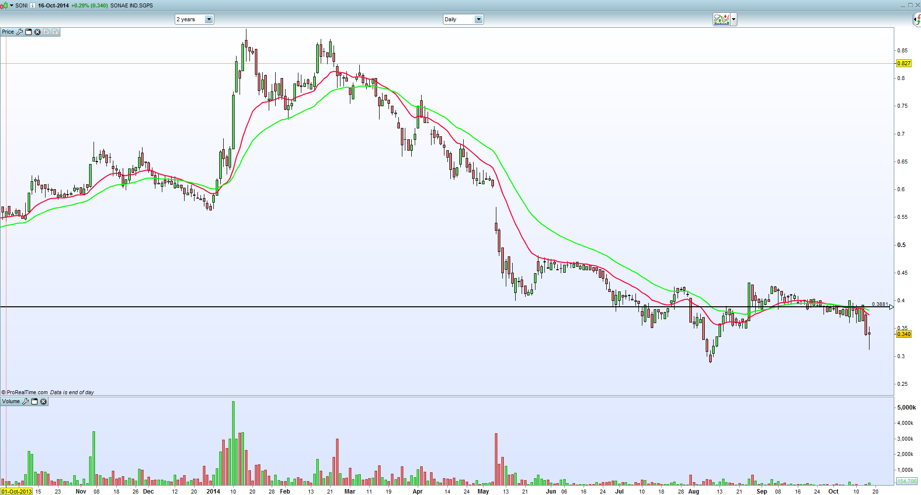 A tendência da SONI é descendente...quebrou uma LTD, está junto a um suporte, apesar do mais importante ser nos 0,35.