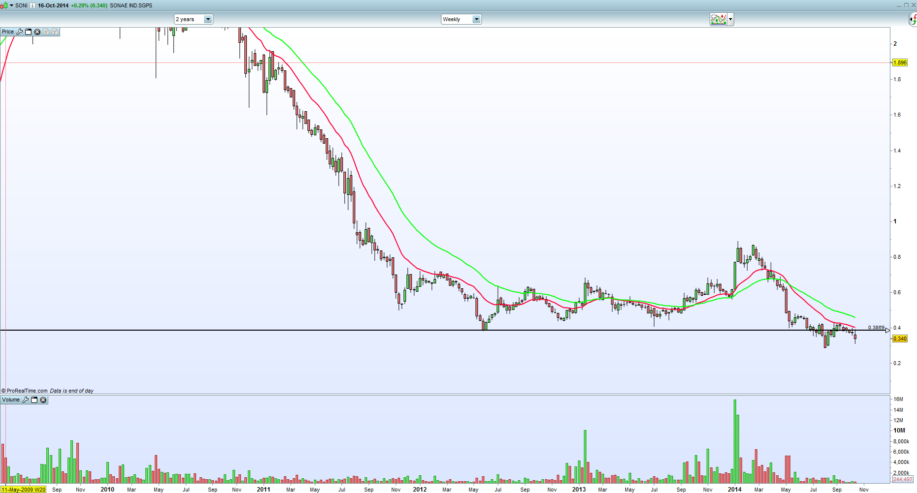 No entanto, Benjamim Graham dizia que existem certas empresas que caiem em longos periodos de prejuizos aproximando-se da falência, e que por vezes basta mudar um pequeno factor dentro da empresa para se inverter o roll descendente. Normalmente essas empresas descem demasiado devido às perspectivas negras, e descem até demasiado que podem vir bastante abaixo do CP aproximando-se dum preço de pré falência. Isso claramente ainda não está a acontecer na SONI porque cota acima do Capital proprio e apresenta prejuizos, logo está cara. Todo esse H&S que projectam tem mais probabilidade de não ser concluído e dar em fiasco. O mercado reconhece isso.