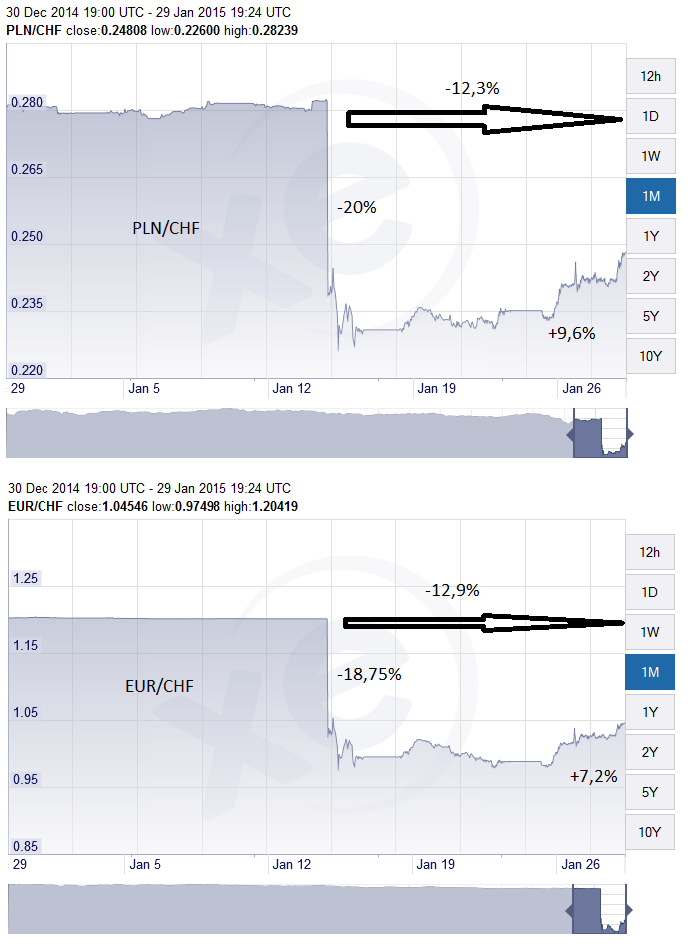 O 1º gráfico reflete a evolução par PLN/CHF, o primeiro impacto varia entre os 0,2824 e os 0,226 (uma quebra de 20%), actualmente está nos 0.24768 (recuperando 9.6% do minimo), teve uma quebra acumulada de 12,3%.