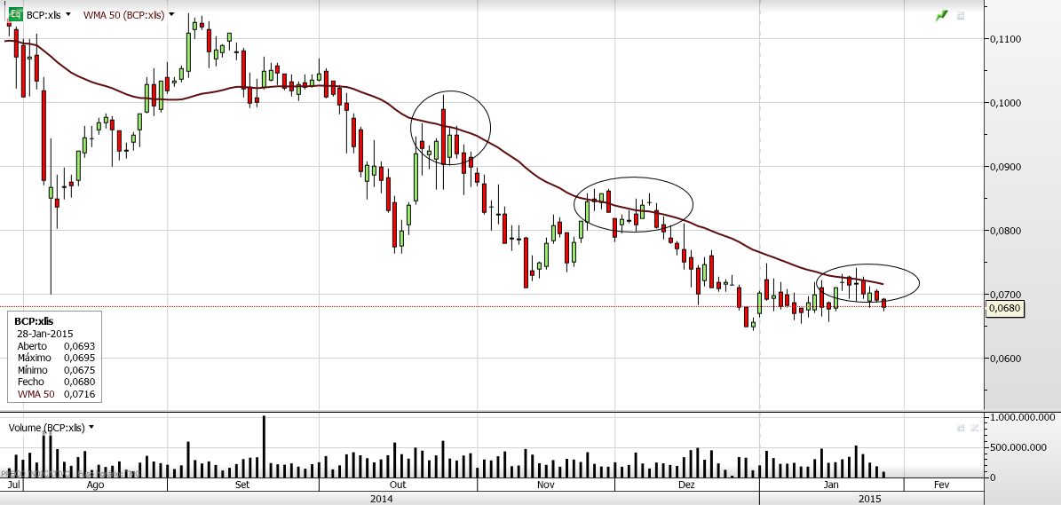 O Pior é aquilo que não pode estar em nenhum gráfico que se construa tendo este papel como base: não há suporte nenhum que agarre uma eventual queda do BCP.