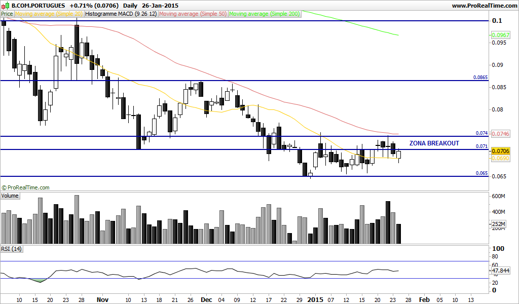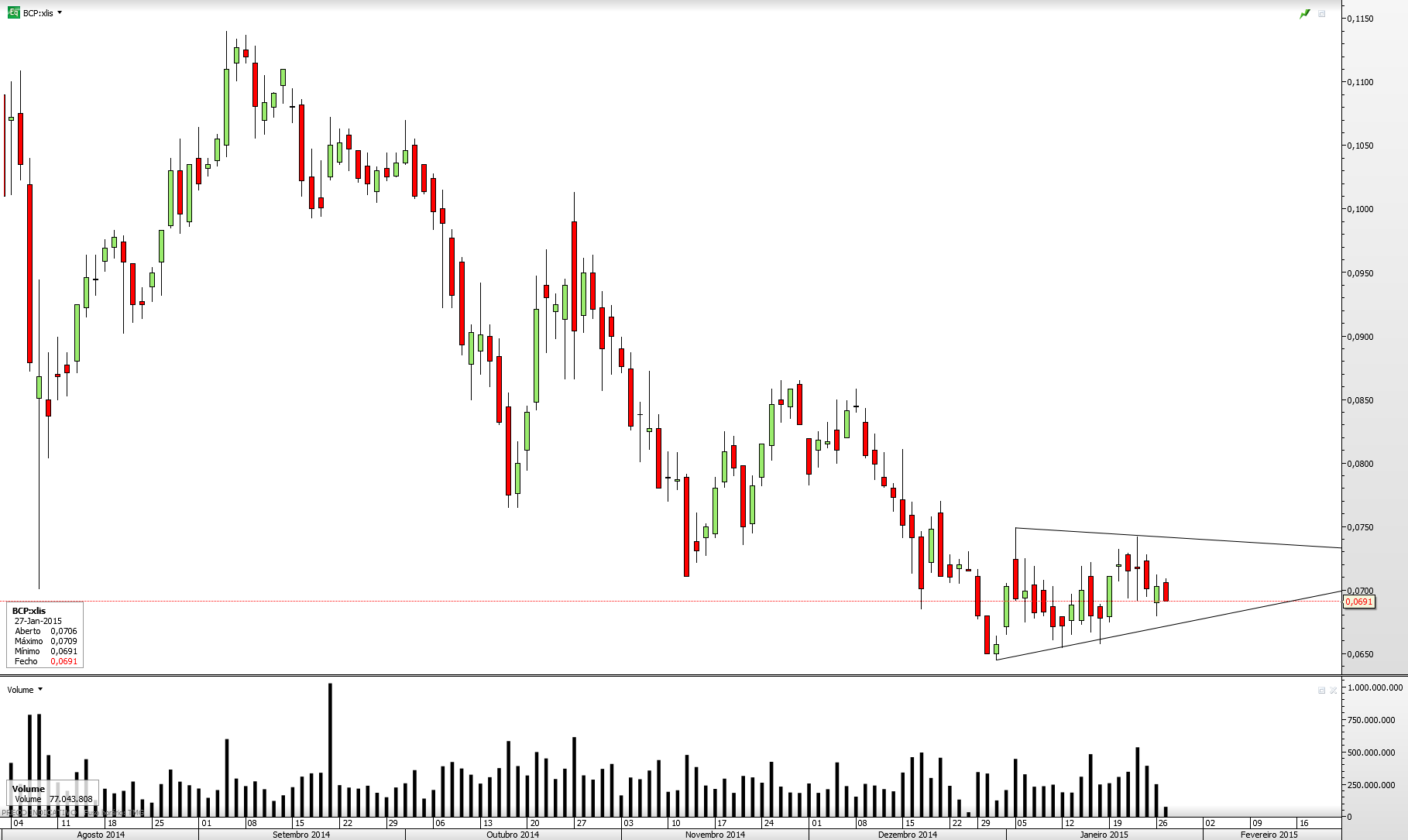 Penso que a cotação já está realmente muito penalizada, e agora próxima semana será o BPI a lançar os resultados (este que também foi muito castigado) ao serem qq melhor que o esperado vai colocar agua na fervura dos bancos Portugueses que realmente estão sob pressão + o QE, pode ser que a cotação tenha encontrado seu suporte nos 7 cêntimos mais coisa menos coisa e aí iniciar a sua recuperação... o dinheiro barato está aí e a rodos