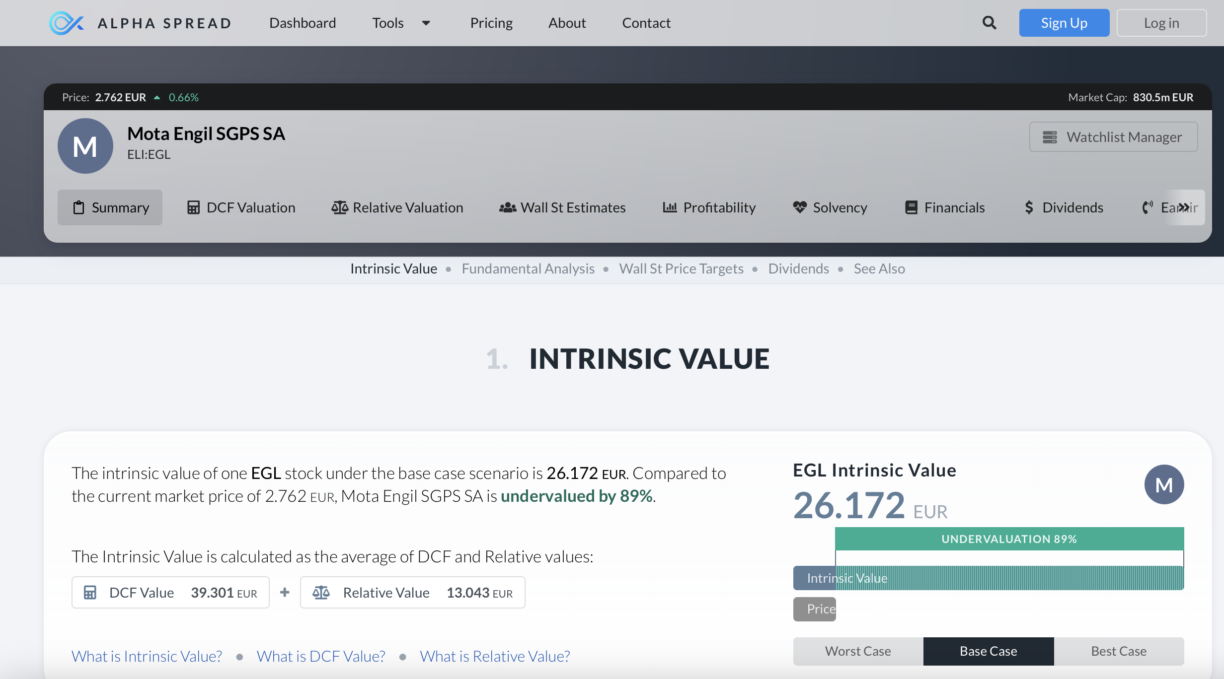 A Alpha Spread usa uma variante própria de um modelo de valorização DCF a 5 anos que deriva um absurdo "valor intrínseco" de 39.3€, depois minorado pela média de um valor relativo calculado com base em múltiplos de avaliação de valor como o P/S, P/E, P/B, EV/EBITDA, EV/FCFF (entre outros), que deriva um valor, também absurdo, de 13€ dado que usa como base de comparação, empresas não comparáveis.