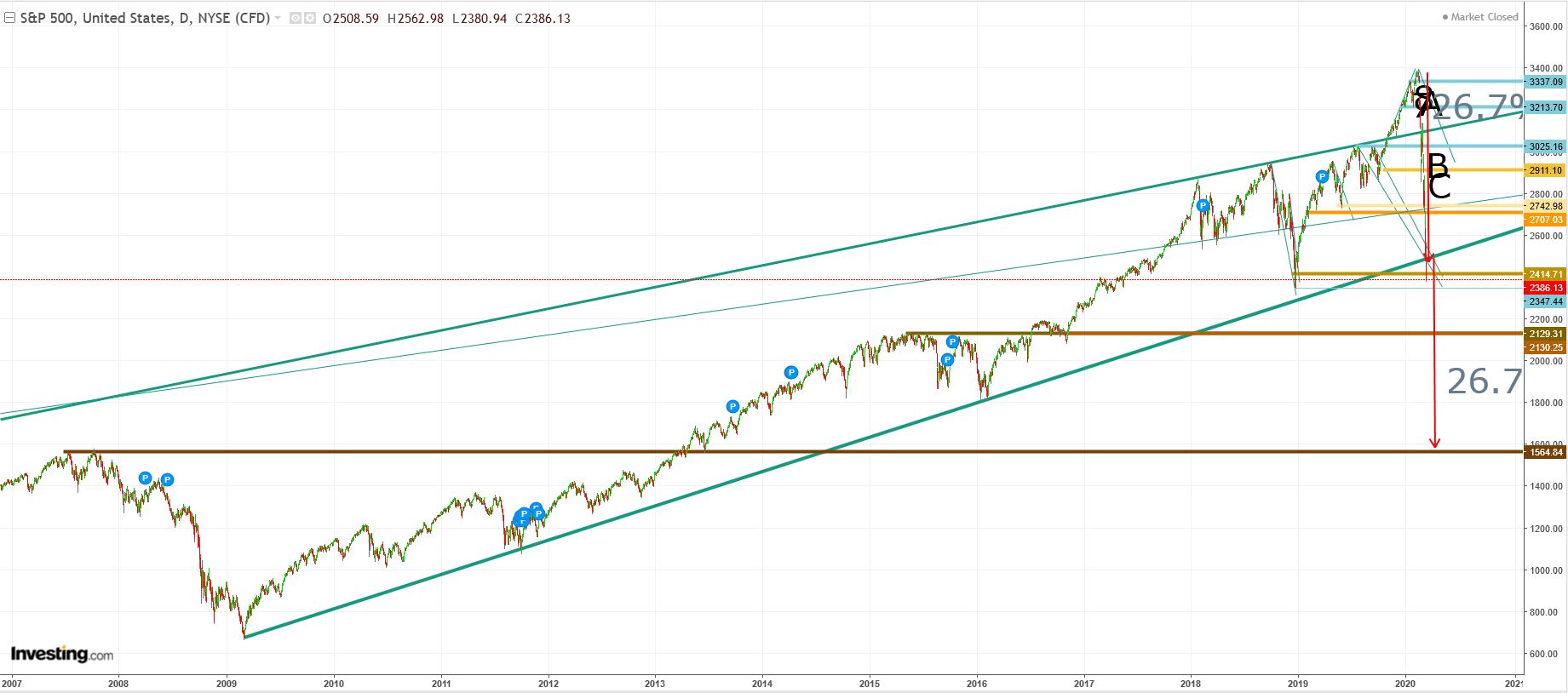 nota - Esta fase Bear dos mercados, que se pode prolongar até aos 50% de queda no S&P (já caiu 34%), antecipa e desconta 2 trimestres fortemente recessivos (-4% no PIB do 1º trim./-6% no PIB do 2 ºtrim. e de -1,8% no total do ano, após recuperação nos 3º e 4º trimestres) e significa que o Shutdown viral nos USA, em ambiente deflacionário destrói mais valor do que uma Guerra (September eleven, 2ª Guerra Mundial ou Vietnam, o PIB continuou sempre a crescer com vigor, apenas com a inflação a fazer mossa na 3ª referida), e a queda abrupta de 34% também indica que o Virus atacou mais depressa do que a brutal crise financeira de 2008: nessa crise os aviões continuavam a voar, os consumidores continuaram a consumir, um pouco menos, e o tecido económico continuou a funcionar em moldes normais (excetuando sistema financeiro que esteve próximo de um colapso generalizado).