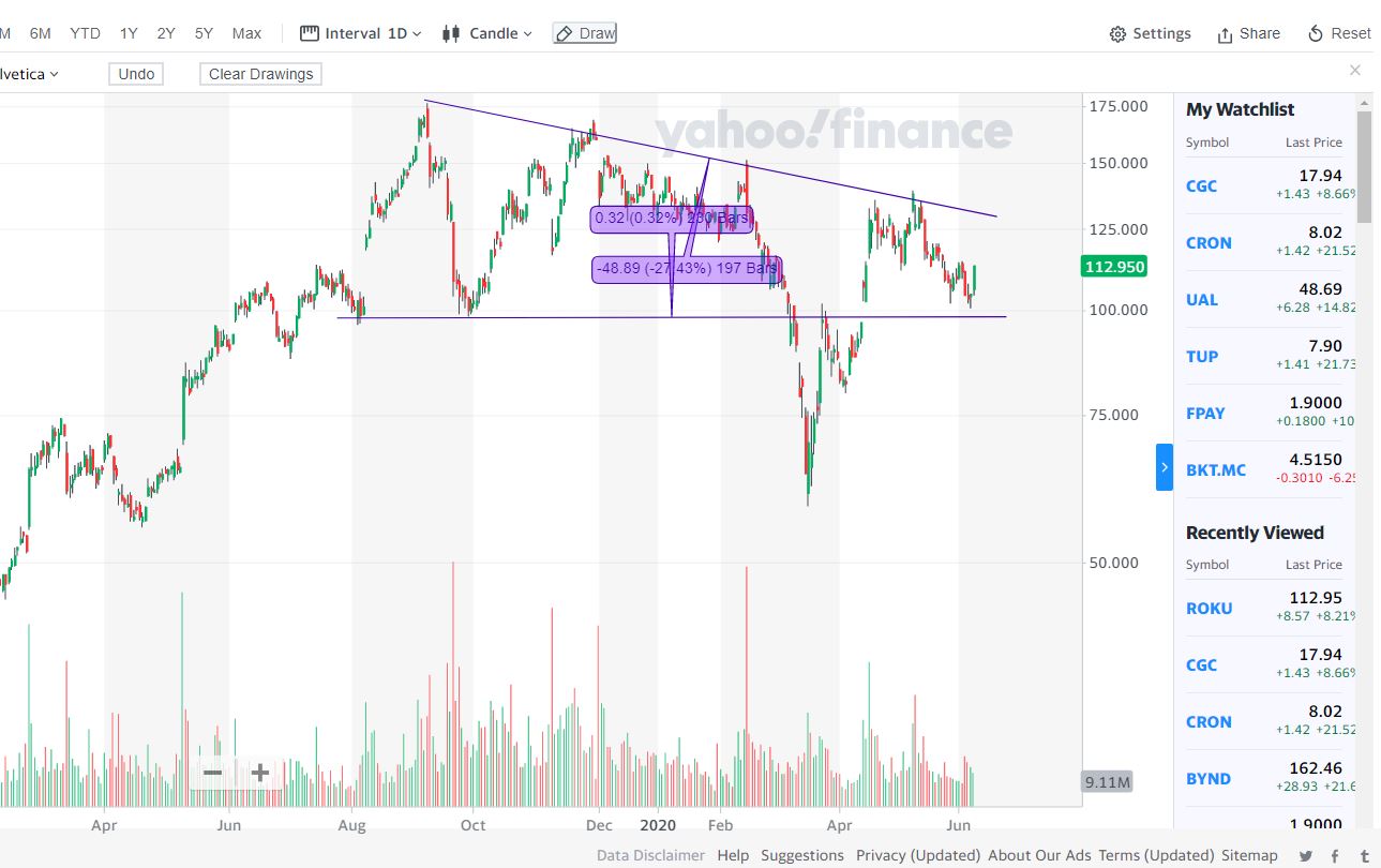 Em relação À ROKU parece interessante. Pode subir até aos 130. Mas acho q tem mais probabilidade de ir aos 80. Nesta nao me vou meter pra ja, mas vou seguir.