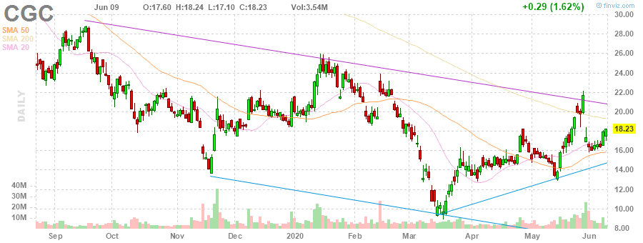 Estava a pensar entrar na CGC mas numa coisa mais para longo prazo ... embora acho que curto também pode dar umas alegrias passando ali a barreira dos 18/20.. no entanto neste momento não se sabe bem se isto está para andar a cair como na semana passada.. Acho que o futuro da CGC no longo vai depender muito do próximo Presidente e da legalização que estão a tentar...Vamos ver também o que sofreram com o COVID 19 mas julgo que poderão existir surpresas positivas...