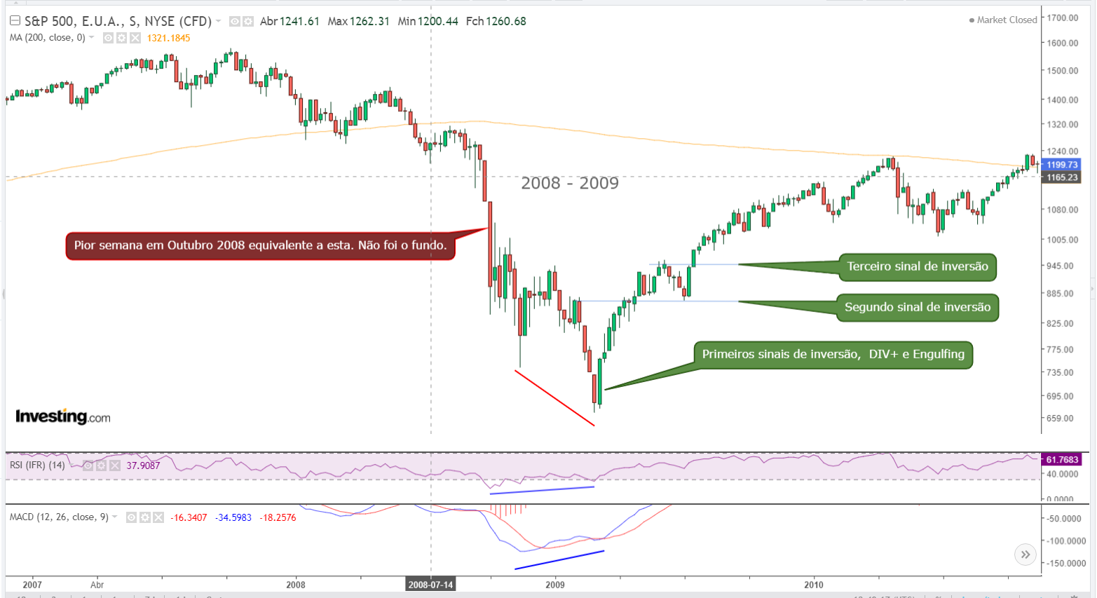 The Navigator Escreveu:Estive a rever o comportamento do SP500 no Bear Market de 2008. Esta semana, antes deste fecho e durante as declarações do Trump, aproximou-se à pior semana de Outubro de 2008. Sem querer fazer comparações, essa semana, apesar de violenta, não provocou a exaustão das vendas. Estas, continuaram até à primeira semana de Março de 2009. Os primeiros sinais de inversão ocorreram a partir daí. Enquanto não assistirmos a sinais equivalentes de inversão, nada se pode dizer sobre o que temos pela frente.