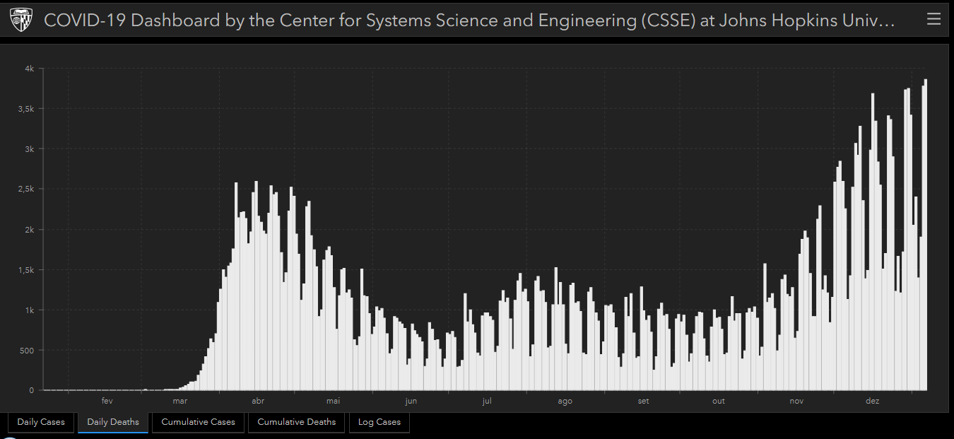 Este número supera as 3.775 mortes contabilizadas na terça-feira pela mesma instituição norte-americana.