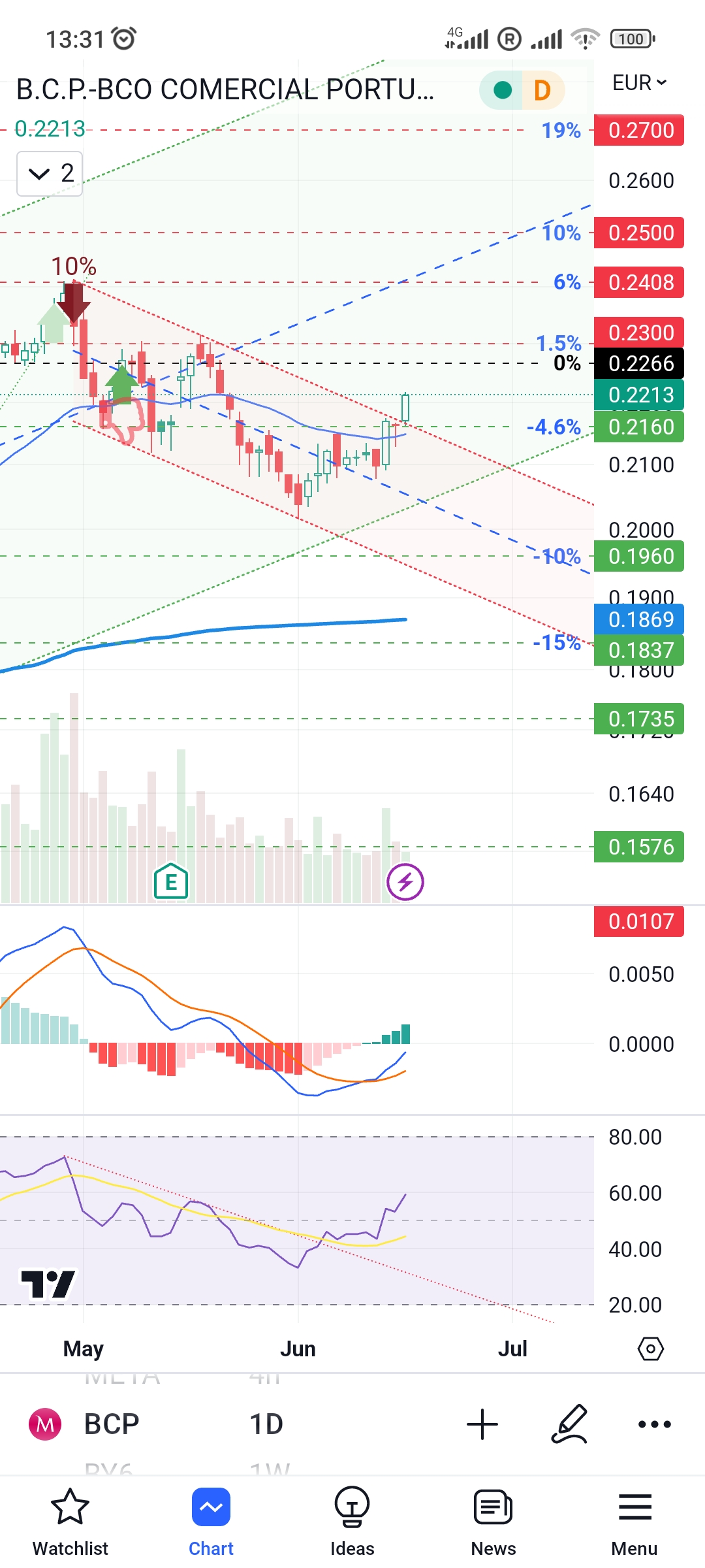 Arlos Escreveu:Acabei de reforçar a posição. Objetivo chegar aos 0,24. Se baixar mais de 2% vendo. Tenho que arriscar. Este ano o BCP tem-me dado muito dinheiro!!