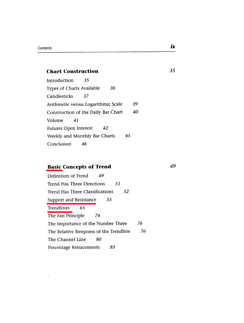 Ulisses, tu podes discordar com o que eu te digo, mas se pegares num qualquer manual de AT repararás que não só o manual inicia a AT pelas linhas de suporte e resistência, como vai muito para além disso... Não sou eu que o digo; está em todos os manuais da AT! A começar pelo John Murphy! Ora repara lá na forma como o autor arrumou o seu livro (deixo-te a página do livro que também referes na bibliografia...Julgava que o conhecias). Repara que a matéria é abordada a partir da página 49 do manual que tem 542 páginas! Segundo ele, linhas de resistência e suporte e tendência, são o básico e limitadas ao estudo da tendência. Ulisses, isso todos sabem fazer...