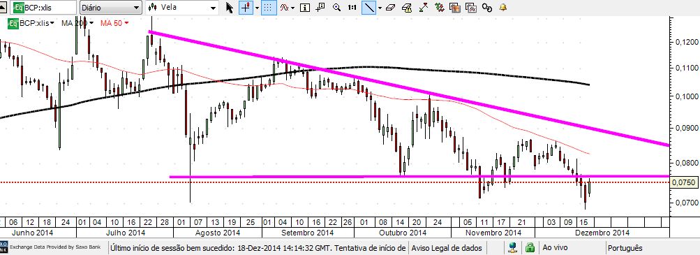 O BCP fez 1 falso break no 3º toque de Novembro, que não se concretizou e o que deixa em duvidas é se desta vez o quebrou mesmo e a vela verde hoje é um ressalto á base do triângulo (para continua a queda como o BPI) ou (espero eu) nova tentativa falhada.