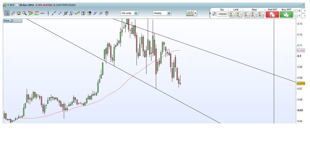O BCP está num canal descendente e intersecta o eixo do X (preço=0 euros) 4-4-2016.