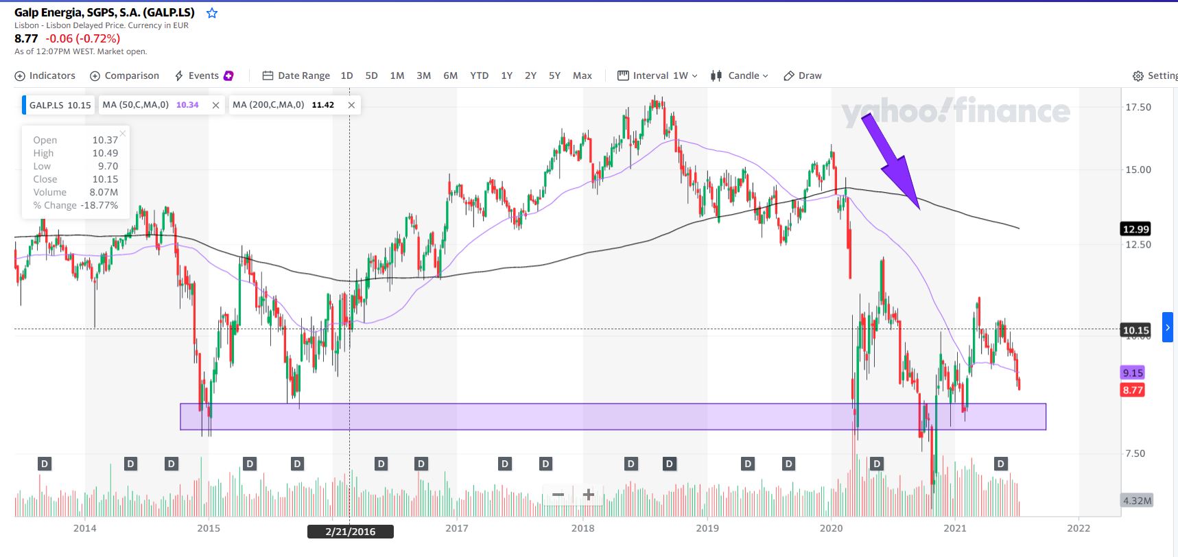 A zona que pintei a lilás parece ser uma zona potencial suporte, mas como também é fácil de observar neste caso, a GALP tem uma zona bastante alargada; em final de 2020 o preço andou perto dos 7€, abaixo da zona referida.